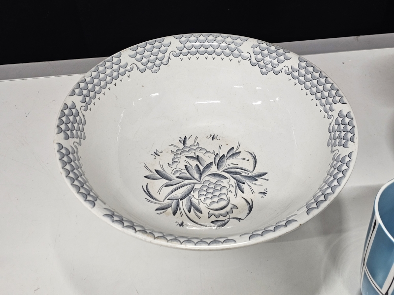 Figuurissa pieniä puutteita, ruudullisessa maljakossa pohjassa särö, pesuvadissa kulumaa, muut ok. Korkein 25cm