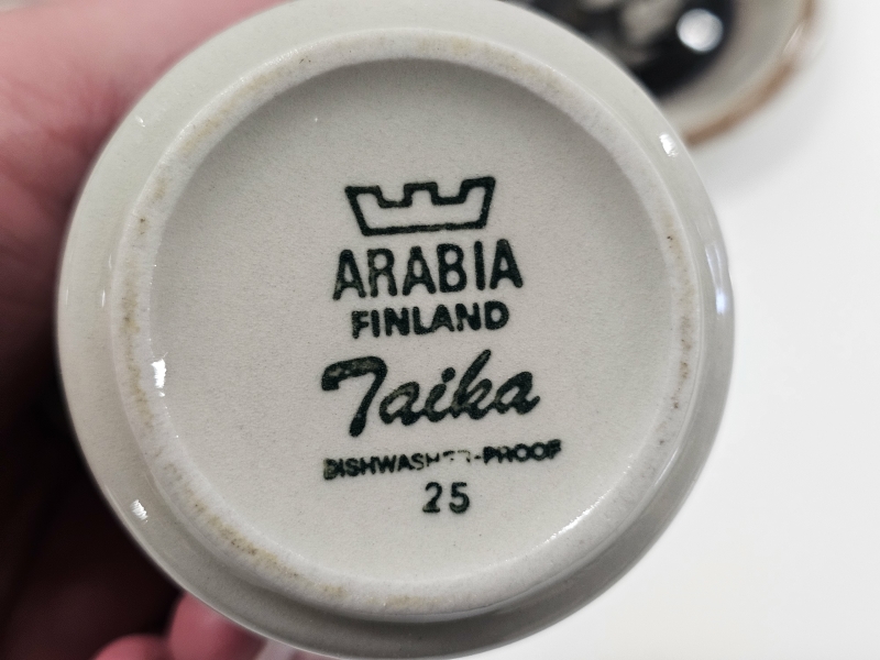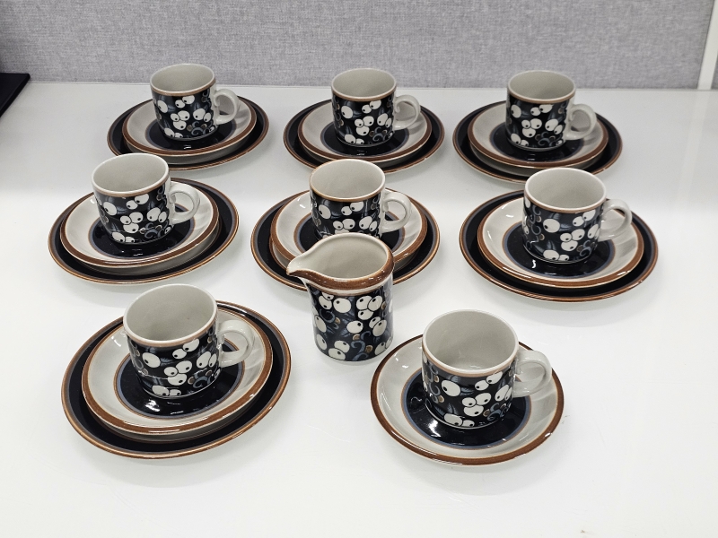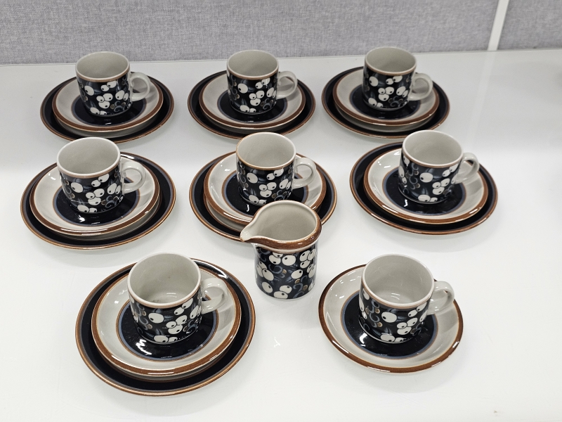 Yksi aluslautanen puuttuu. Lasitteessa hieman käyttökulumaa. Kupin h: 6,8cm