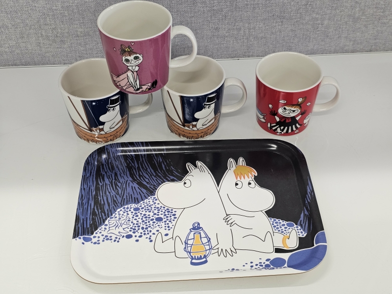 #592 - 4kpl Muumimukeja ja tarjotin: Mm. 2kpl Muumipappa purjehtii