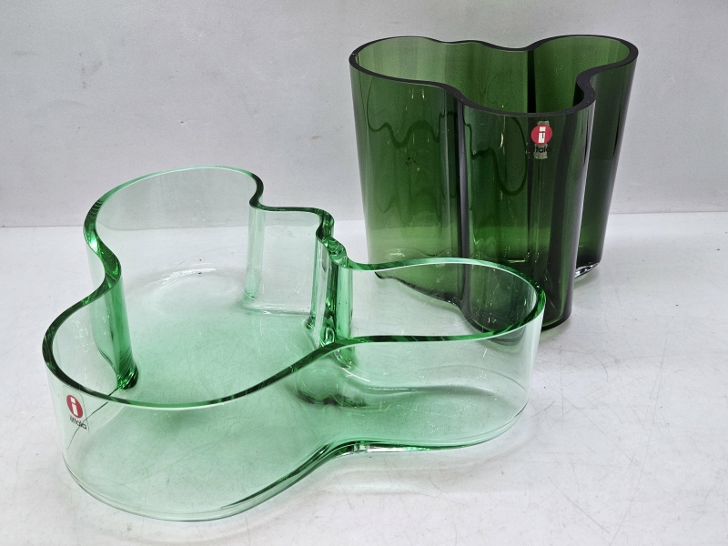 Virheettömiä. Maljakon korkeus 9,5cm, maljan leveys 19,5cm