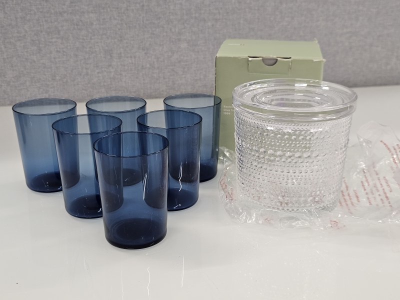 #232 6kpl Timo Sarpaneva juomalaseja + Kastehelmi -purkki