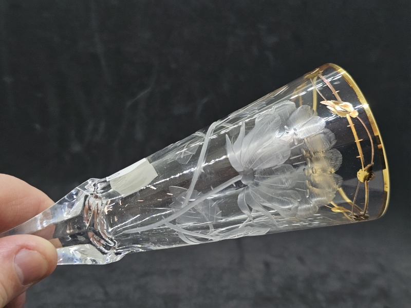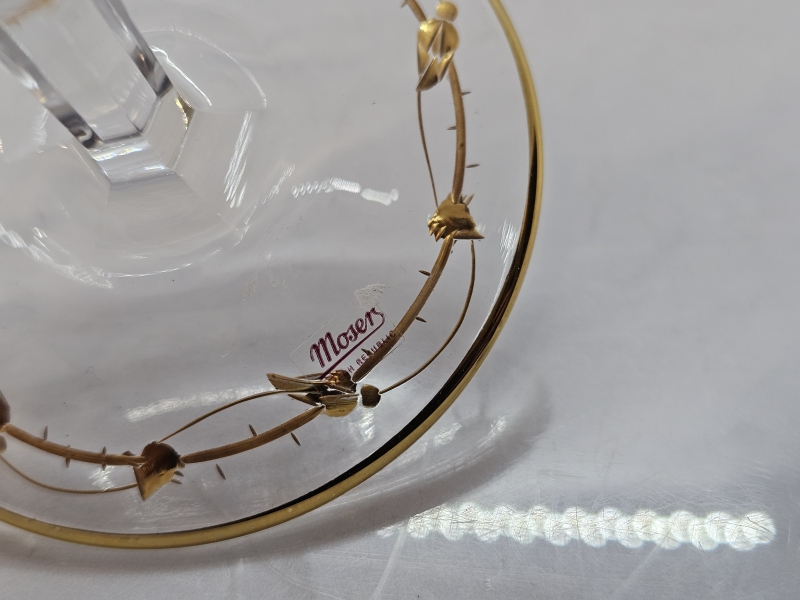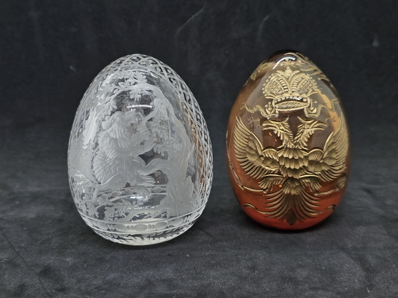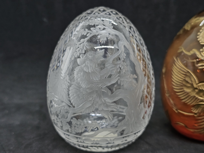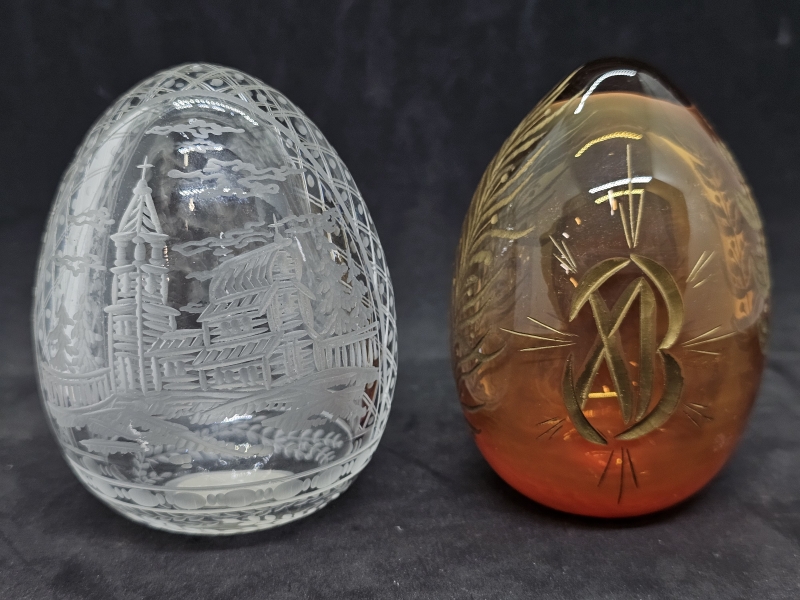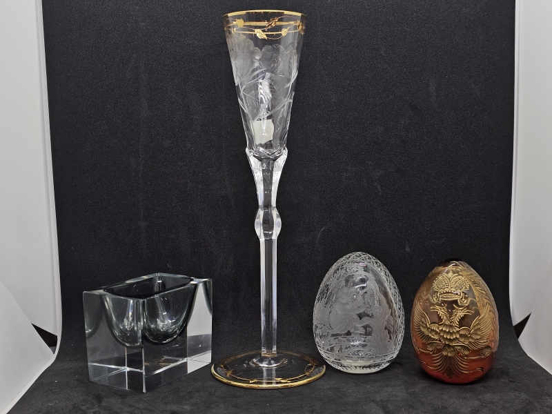 #256 4kpl lasiesineitä: Mm. iso Moser-lasi ja 2kpl venäläisiä kaiverrettuja munia