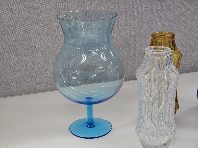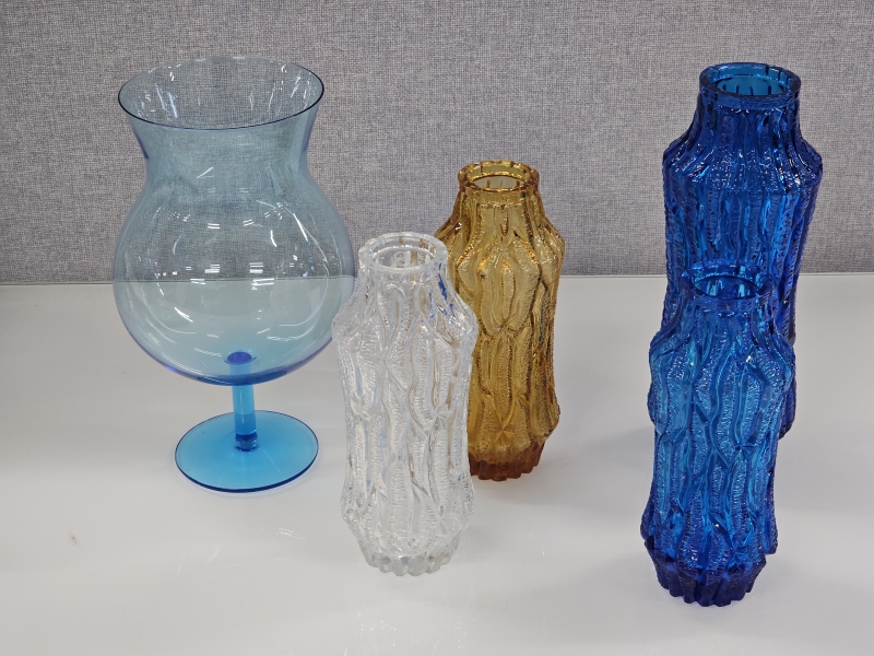 #414 - 5kpl lasiesineitä: Saara Hopea aromilasi + 4kpl Oberglass maljakoita