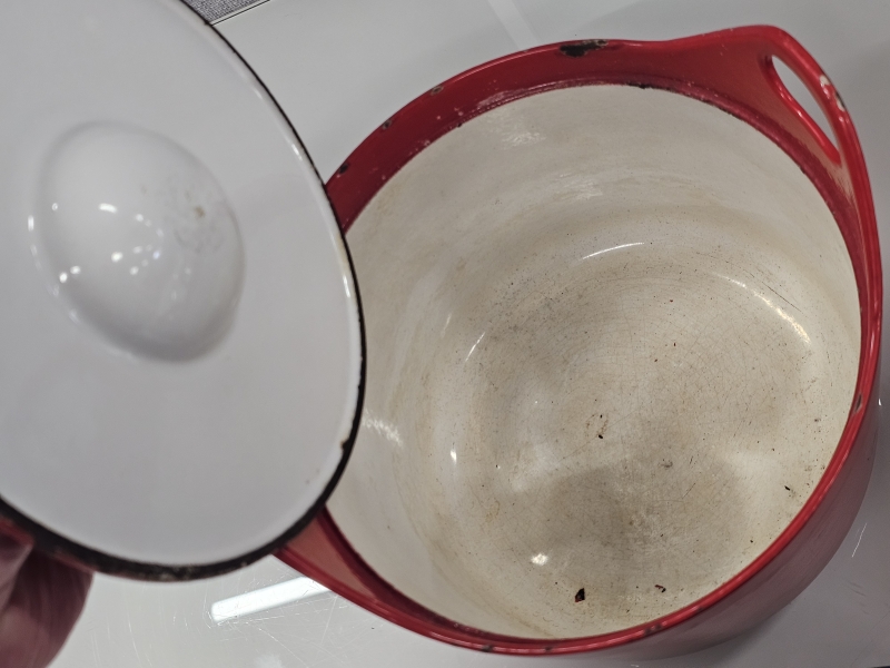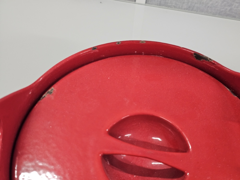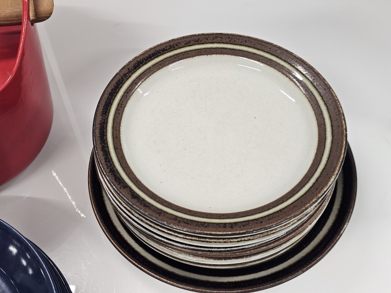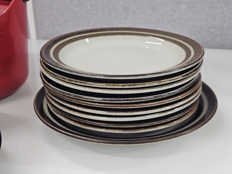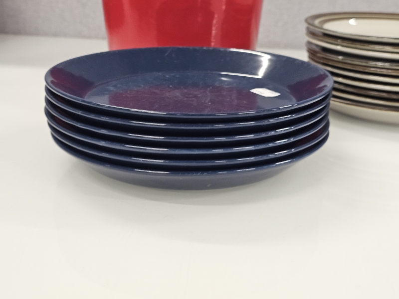 Lautasissa käyttökulumaa mutta ei paloja pois, padassa kolhuja. Isommat lautaset 23cm