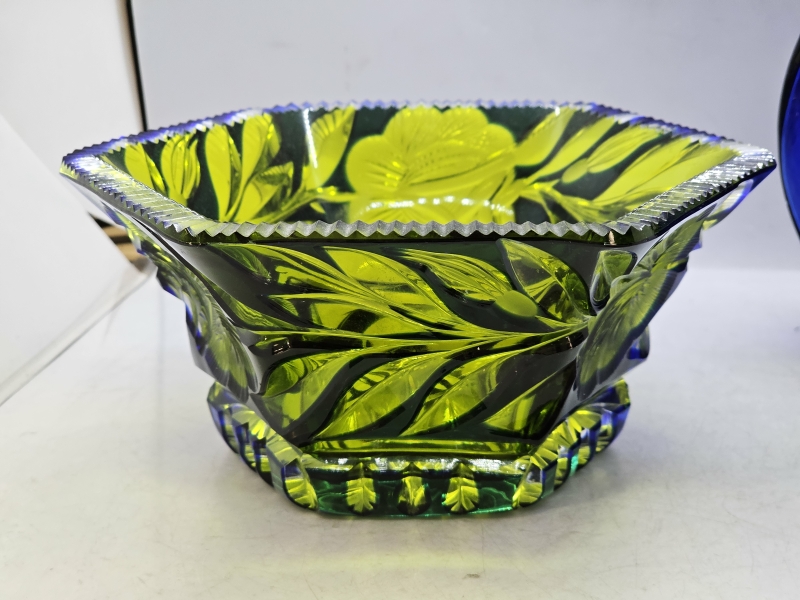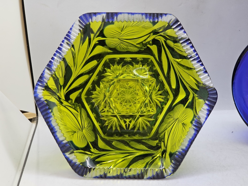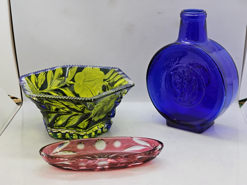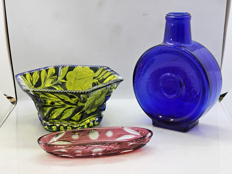 Isommassa maljassa joitakin reunavikoja. Pullon k: 19cm