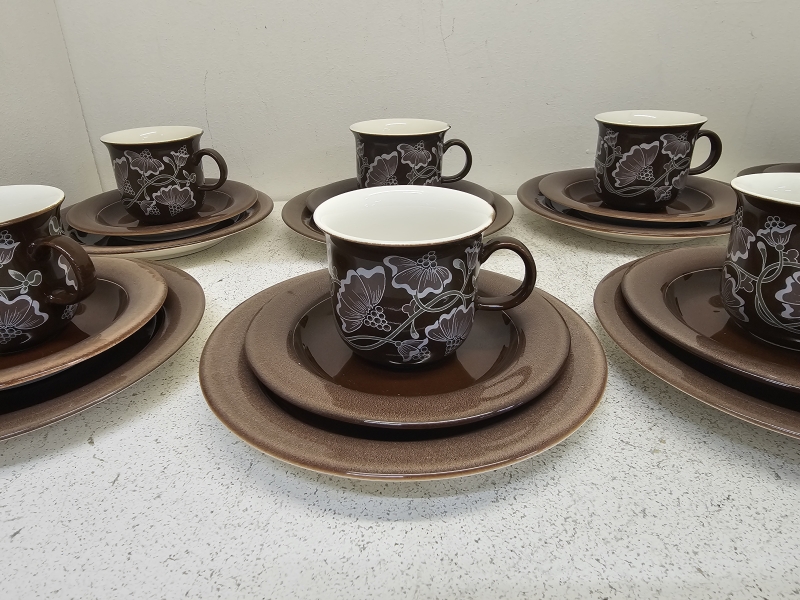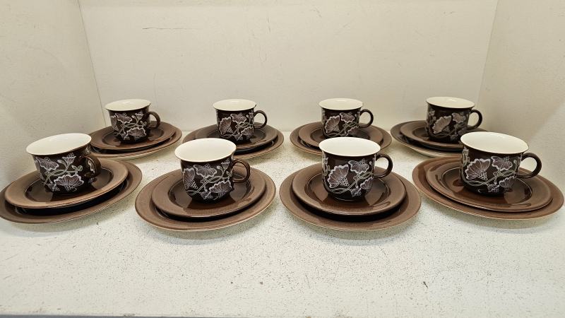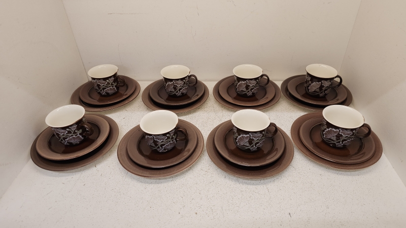 #776 - Arabia, Inkeri Leivo 8kpl Kastanja kuppeja, tasseja ja lautasia