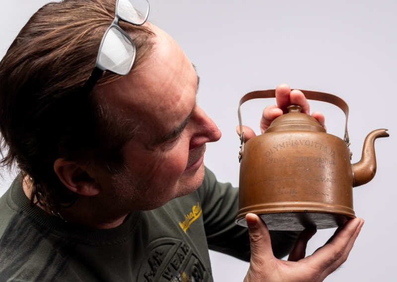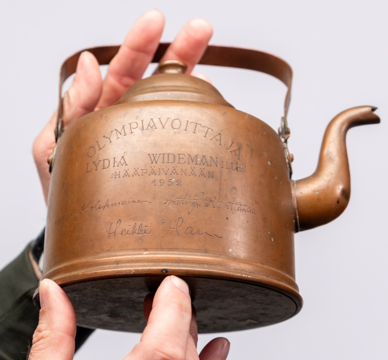 Kaiverretuissa nimikirjoituksissa mm. Tapio Rautavaara, Hannes Kolehmainen, Heikki Hasu, Volmari Iso-Hollo ym. Korkeus kahvan kanssa 19,5cm