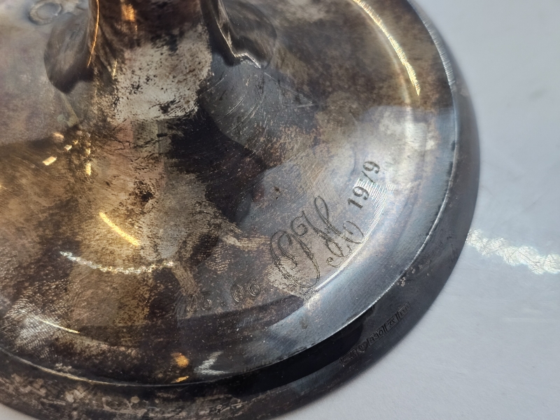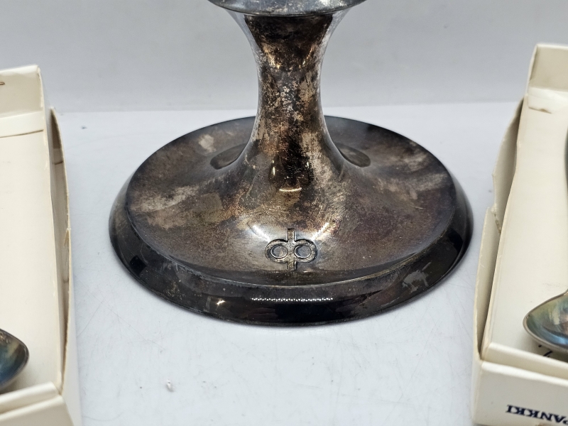 #1355 2kpl hopeisia Osuuspankki kahvilusikoita + kynttilänjalka