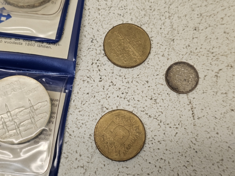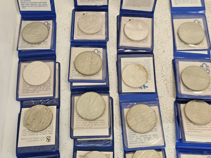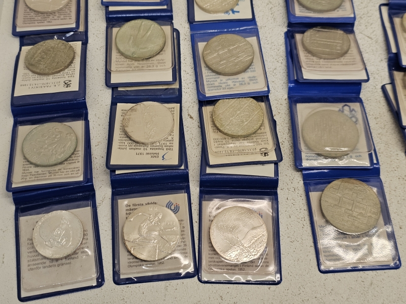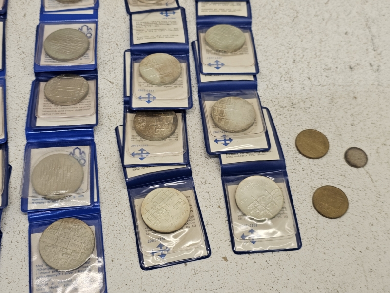 #1238 Erä hopeisia juhlarahoja + 3kpl kolikkoja