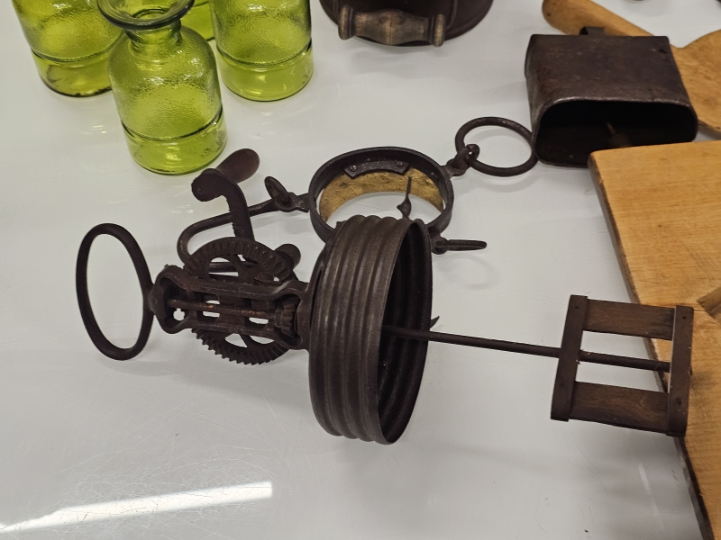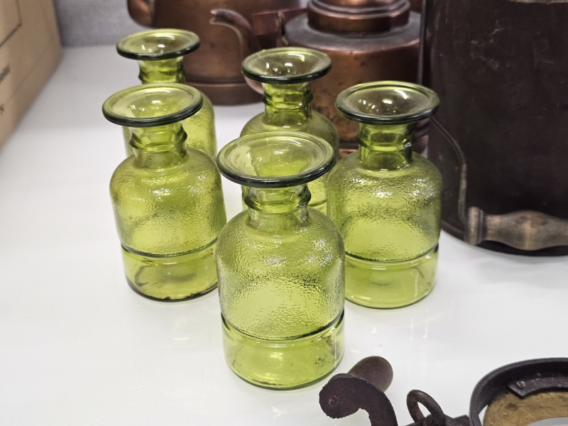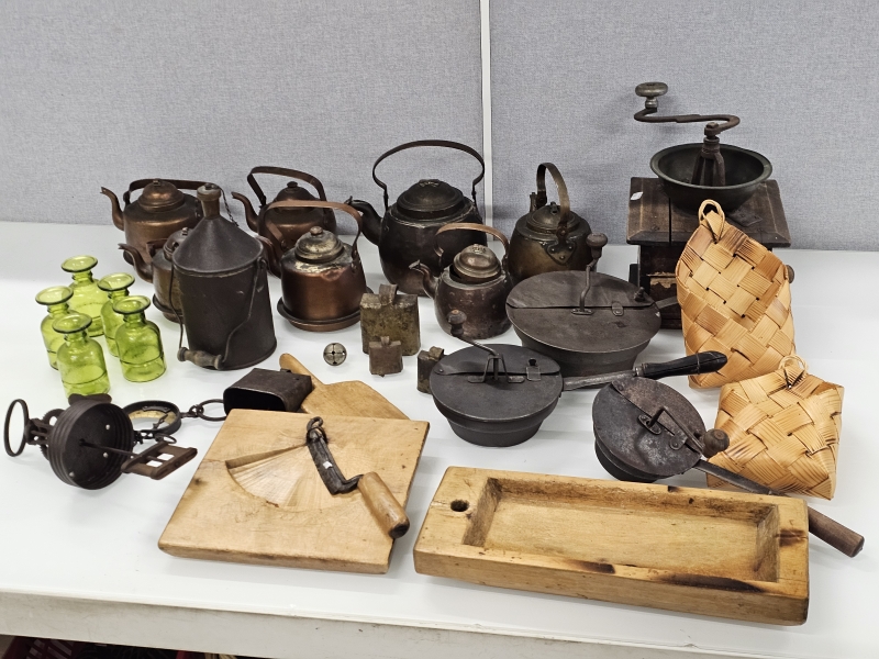 #2096 - Hyvä erä vanhaa esineistöä: Kuparipannuja, paahtimia ym.