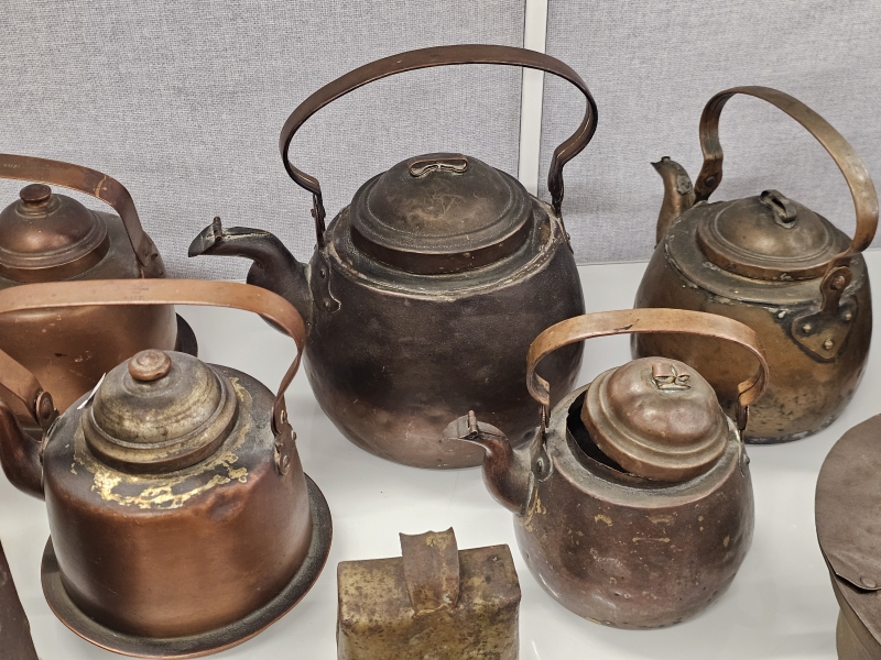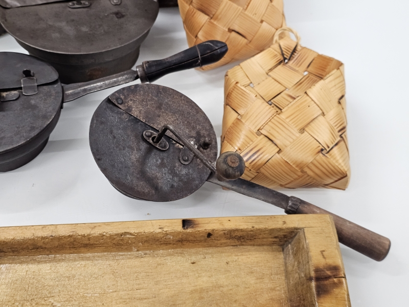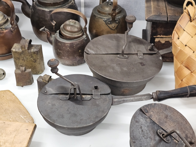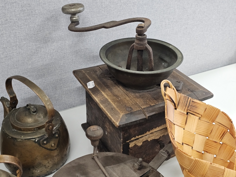 #2096 Hyvä erä vanhaa esineistöä: Kuparipannuja, paahtimia ym.