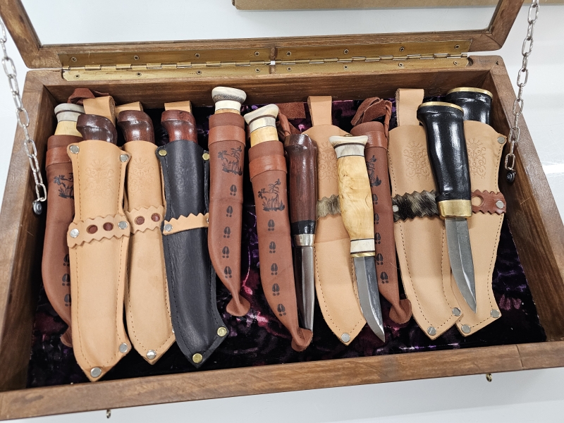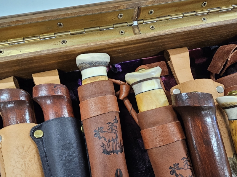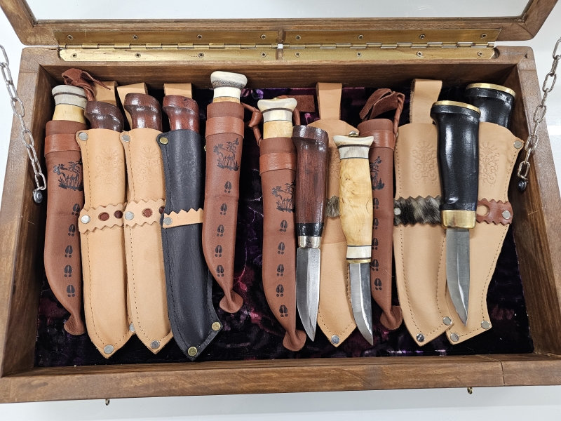#1738 - 10kpl puukkoja + vitriini ja kotelot [mm. 4kpl luuosilla]