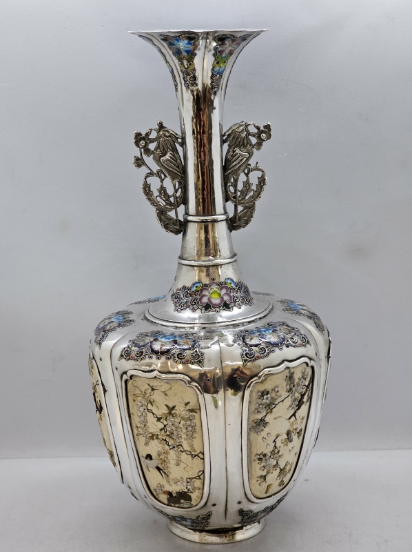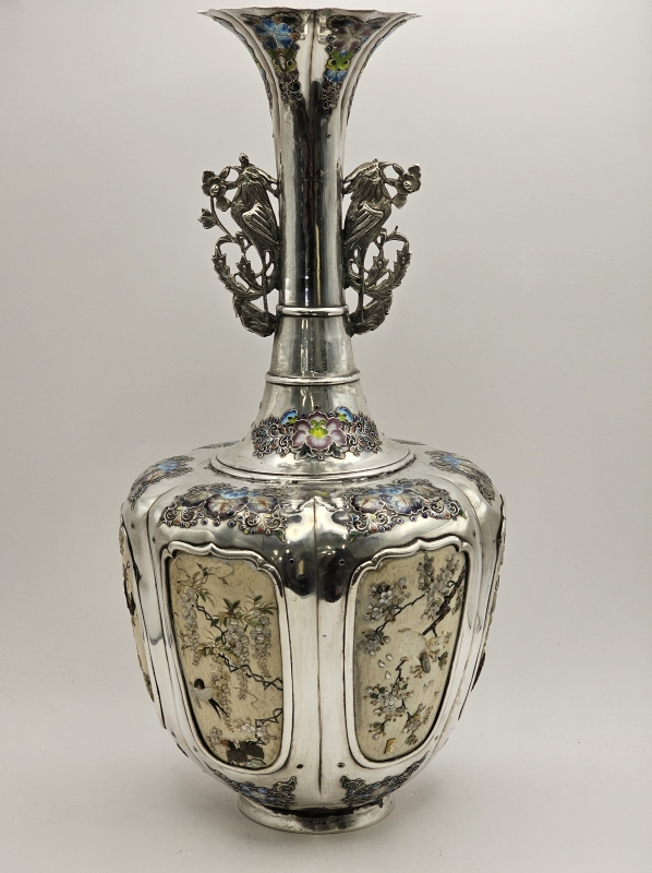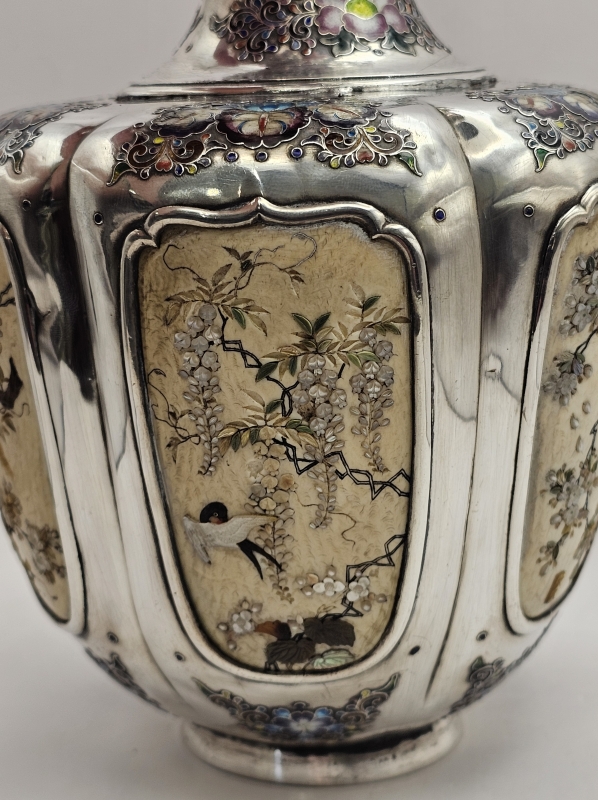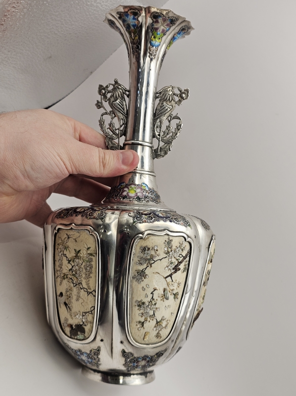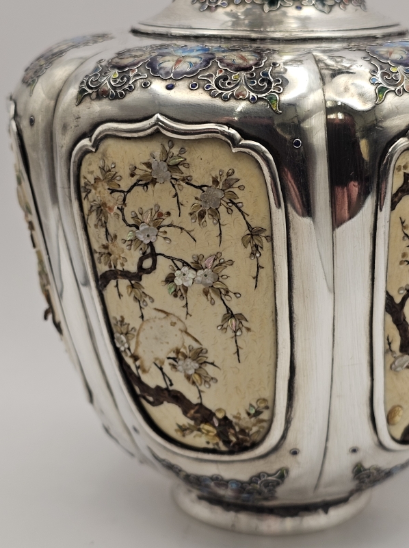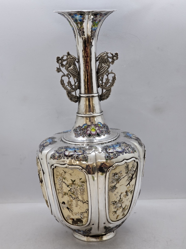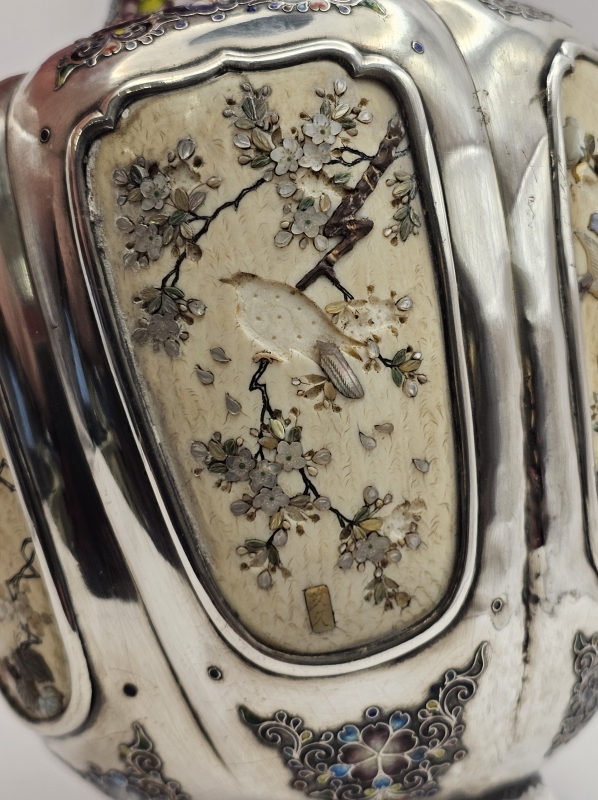 #1815 Poikkeuksellisen näyttävä hopeinen signeerattu itämainen maljakko emali- ja luukoristeilla, 1800-luku, provenienssi: Remu Aaltosen kokoelmasta