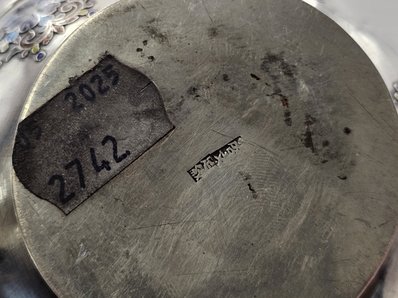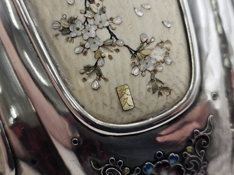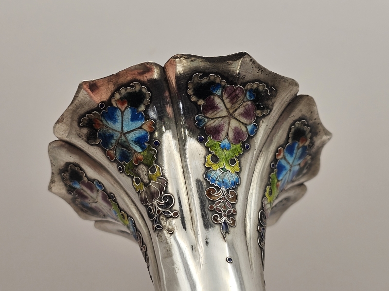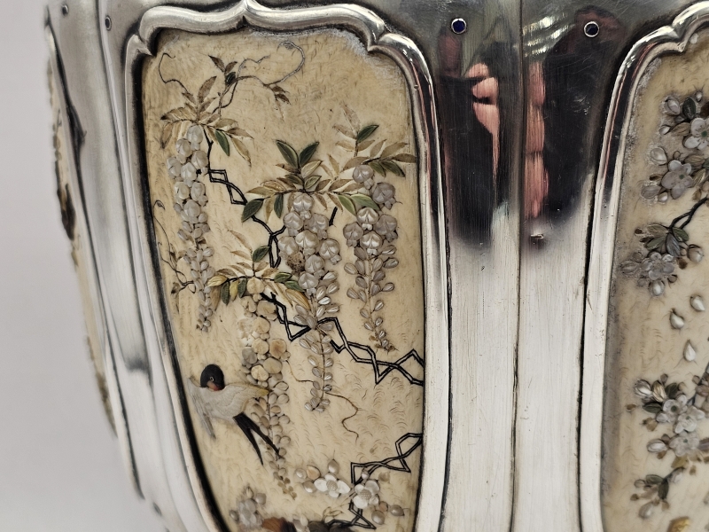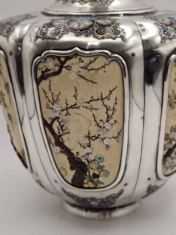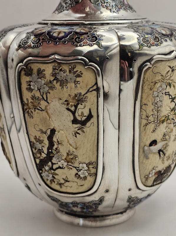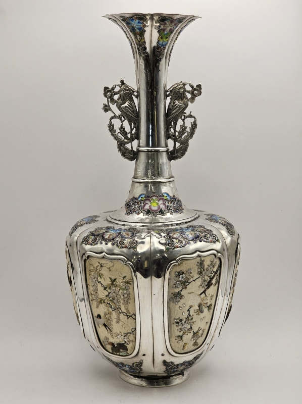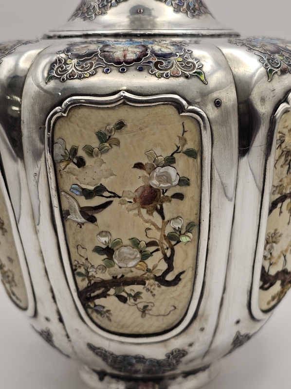#1815 Poikkeuksellisen näyttävä hopeinen signeerattu itämainen maljakko emali- ja luukoristeilla, 1800-luku, provenienssi: Remu Aaltosen kokoelmasta