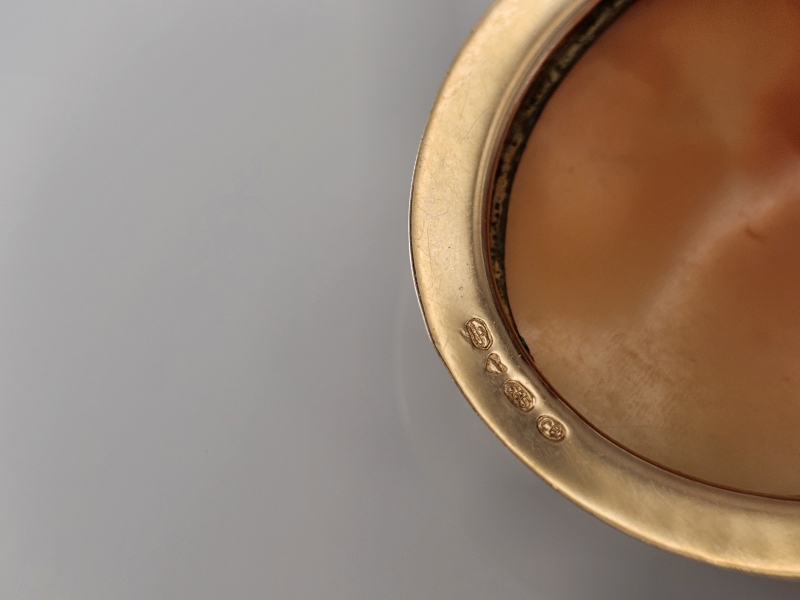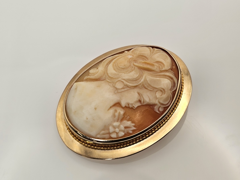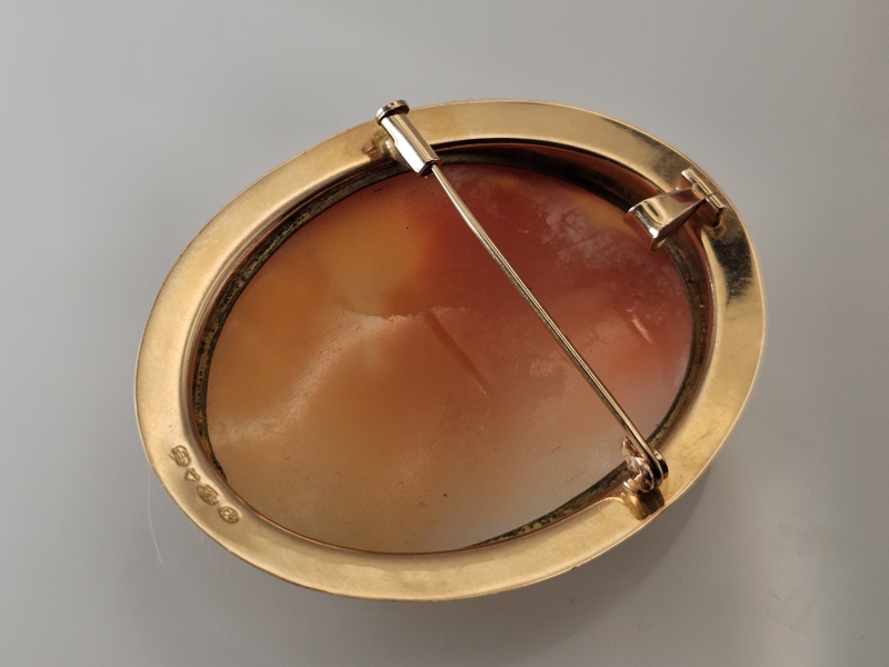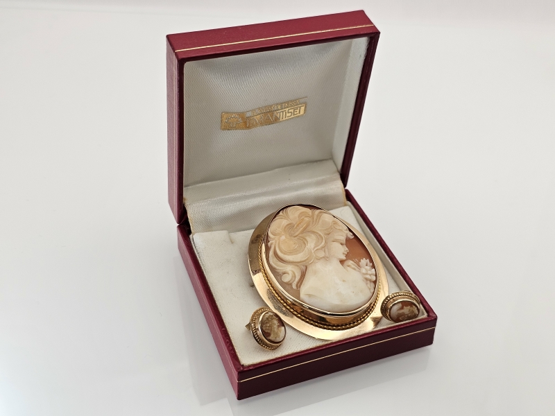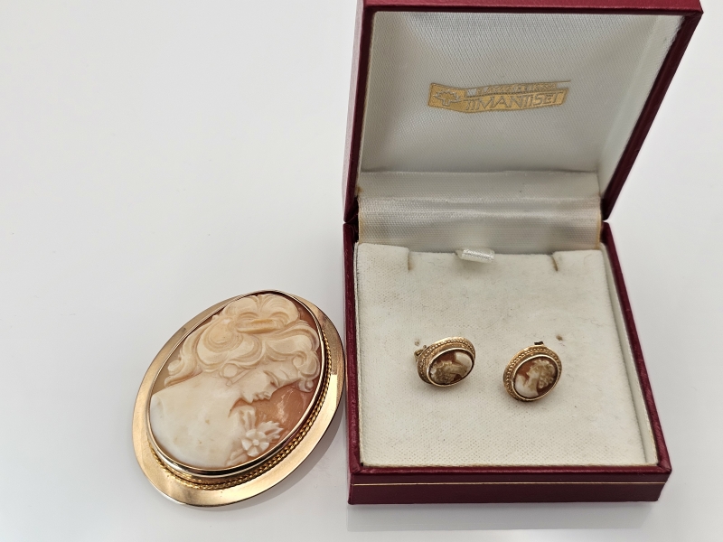 #1170 14k kultainen iso camee rintaneula/riipus + korvakorut, 15,46g