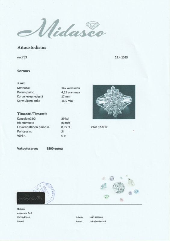 #1393 14k valkokultainen sormus 29 timantilla [yht. 0,95ct], 4,52g