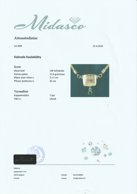 #1481 14k kultainen Kalevala koru kaulakääty turmaliinilla, 27,4g