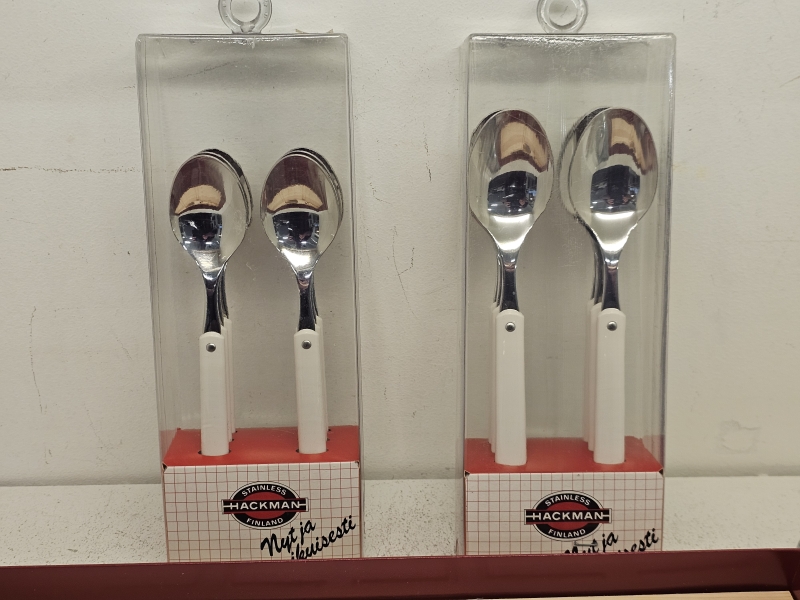 #2340 - Erä aterimia: Iisakki Järvenpää / hopeavartinen kakkulapio / 6+6kpl Hackman Hackminna lusikoita