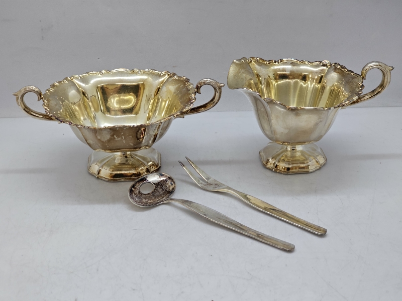 #1434 Hopeinen sokerikko ja kermakko + Tapio Wirkkala hopeaottimet