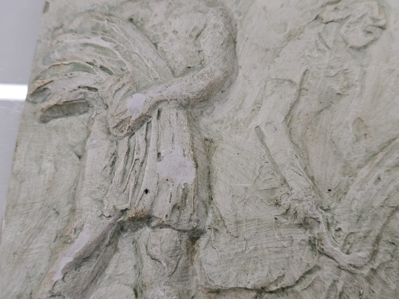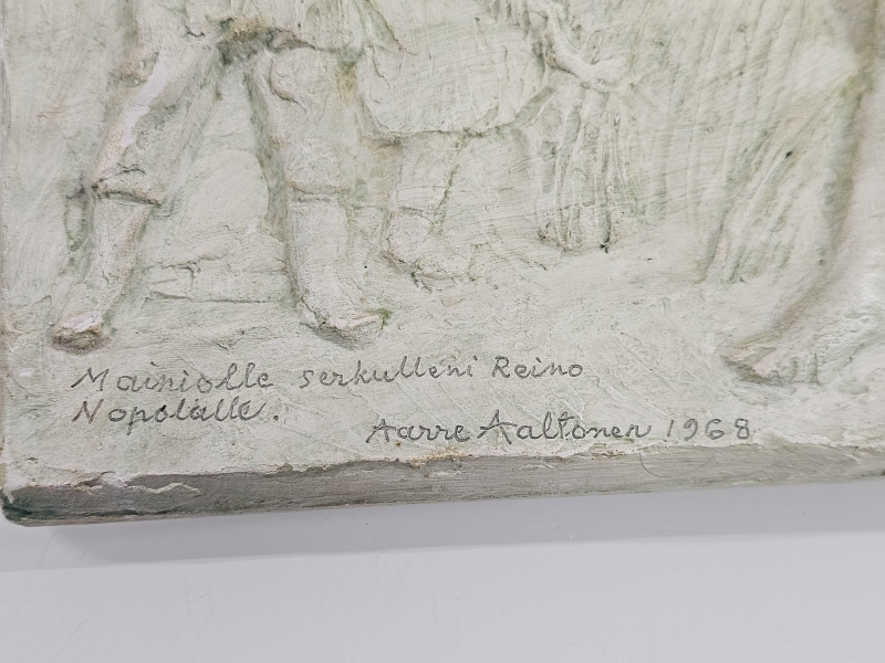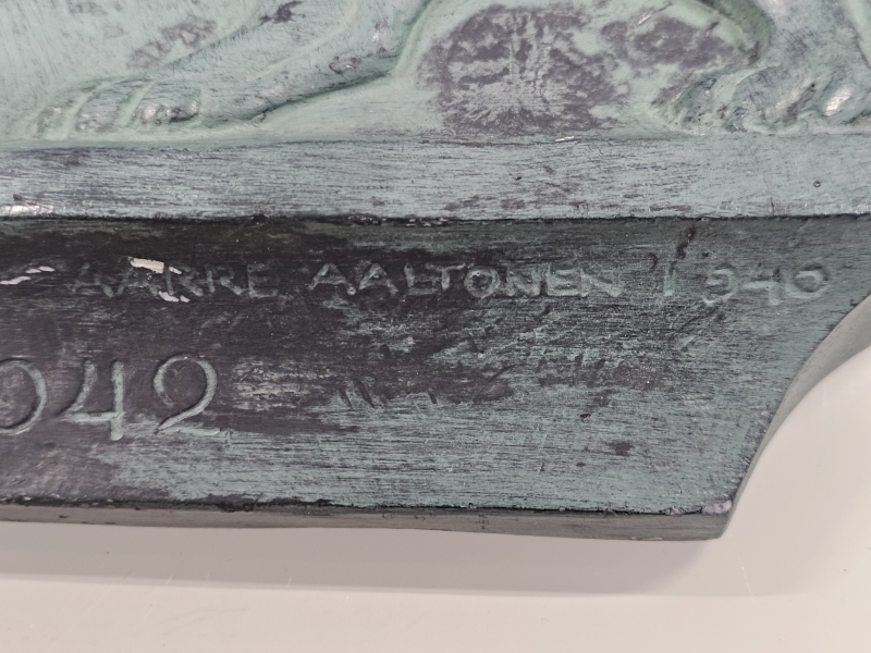 #2012 2kpl Aarre Aaltonen kipsireliefejä: Haavoittunut leijona / peltotyöt omistuskirjoituksella