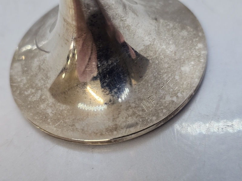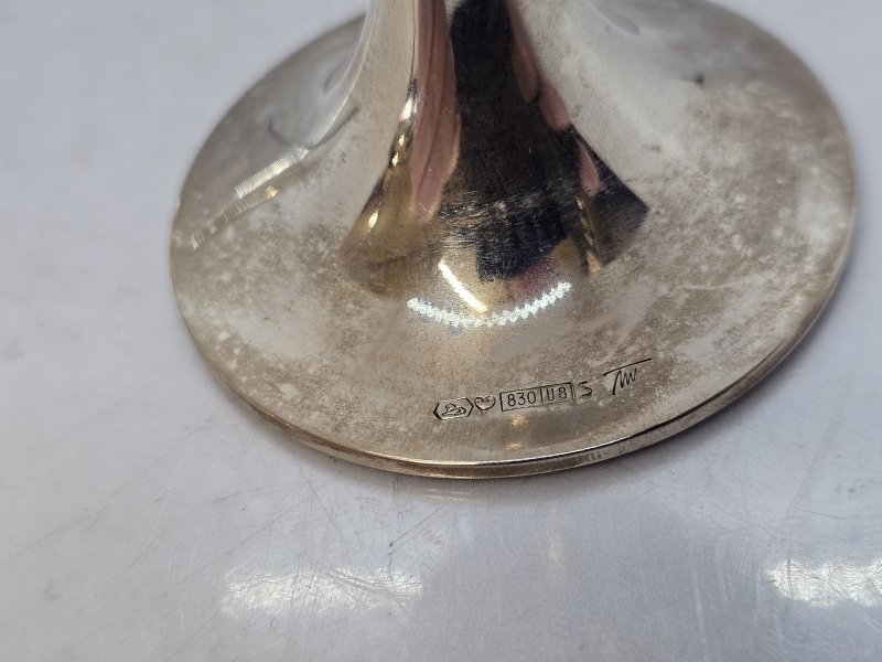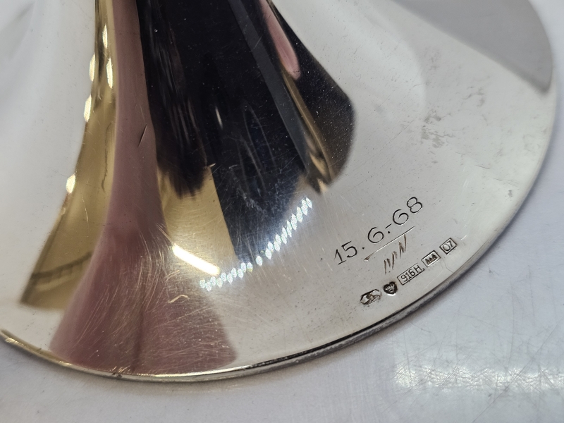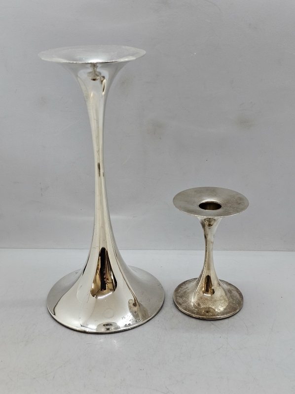 #1459 - 2kpl Tapio Wirkkala hopeisia Trumpetti kynttilänjalkoja, v.1967 / 1997