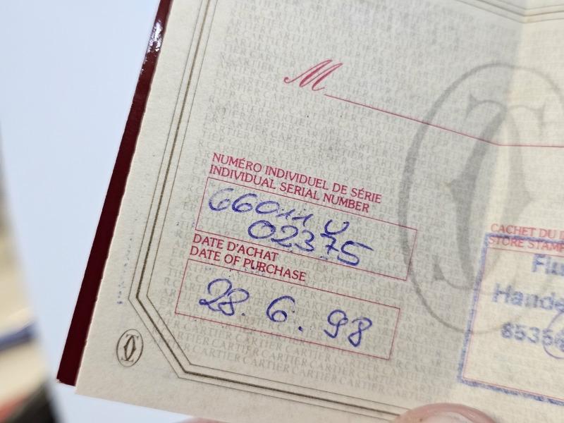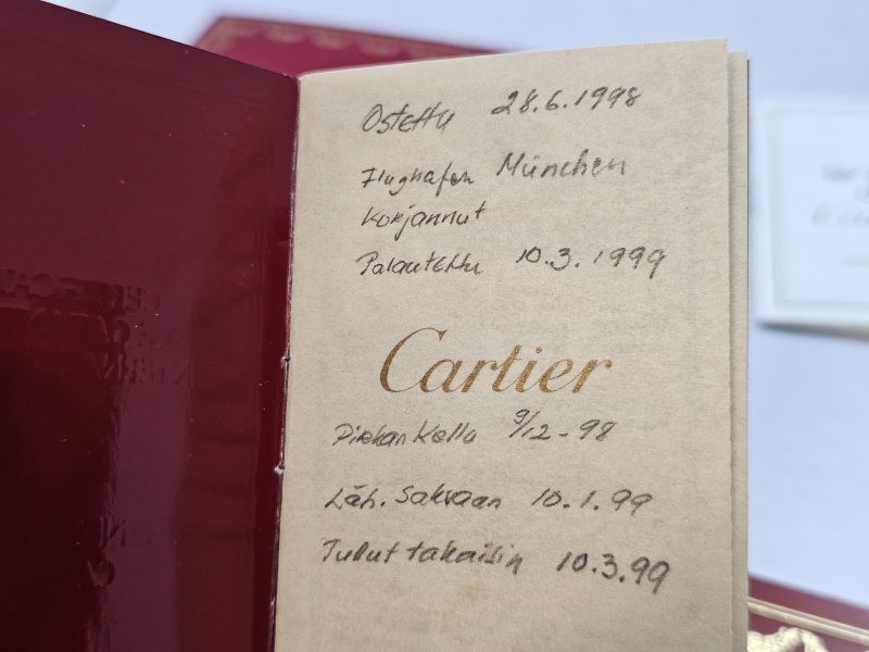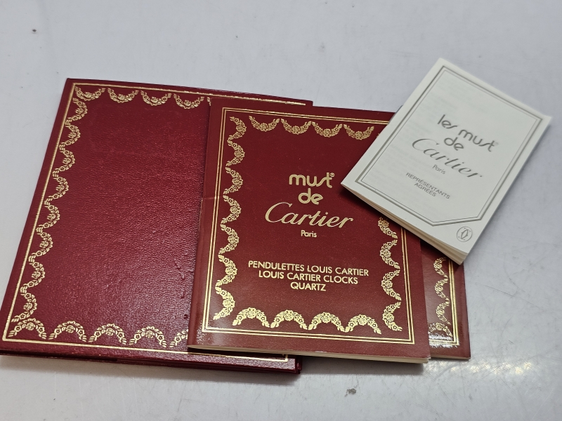 #1232 - Cartier pöytäkello / matkakello rasiassa + aitoustodistukset ym.