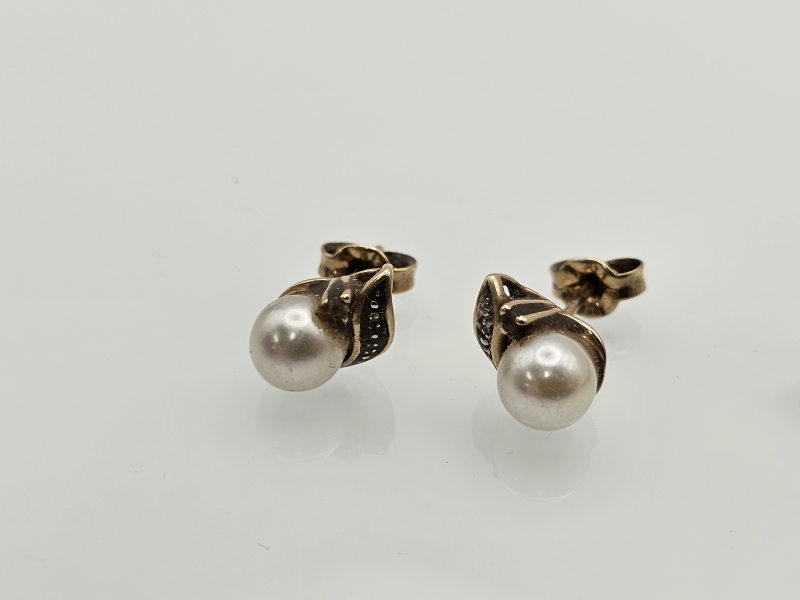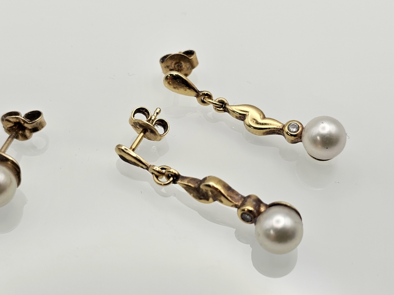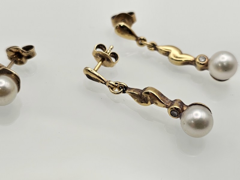 #1564 Kaksi paria 14k kultaisia korvakoruja helmillä ja timanteilla, 6,55g