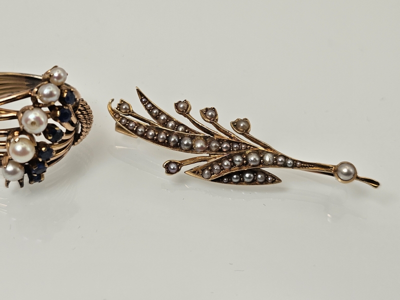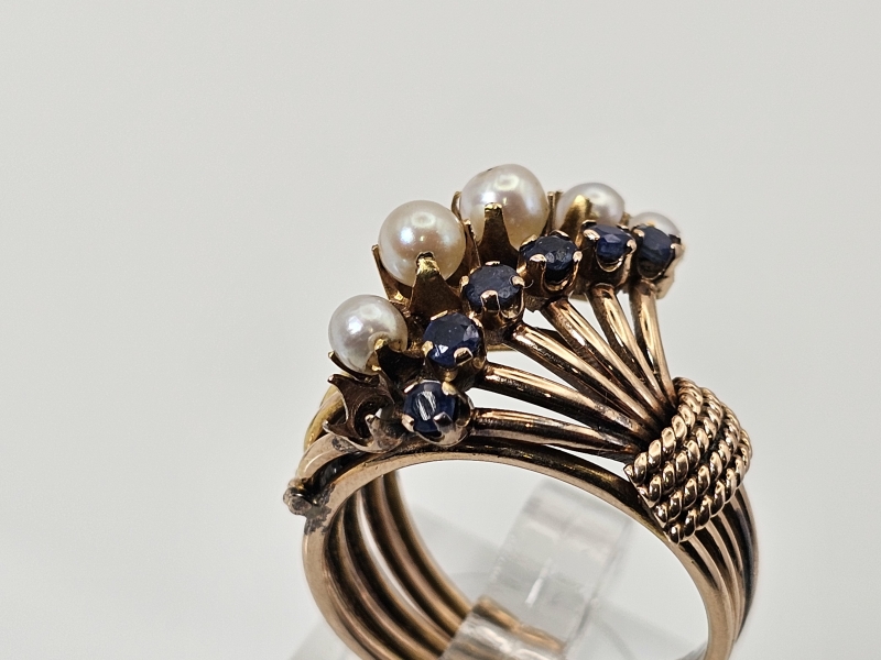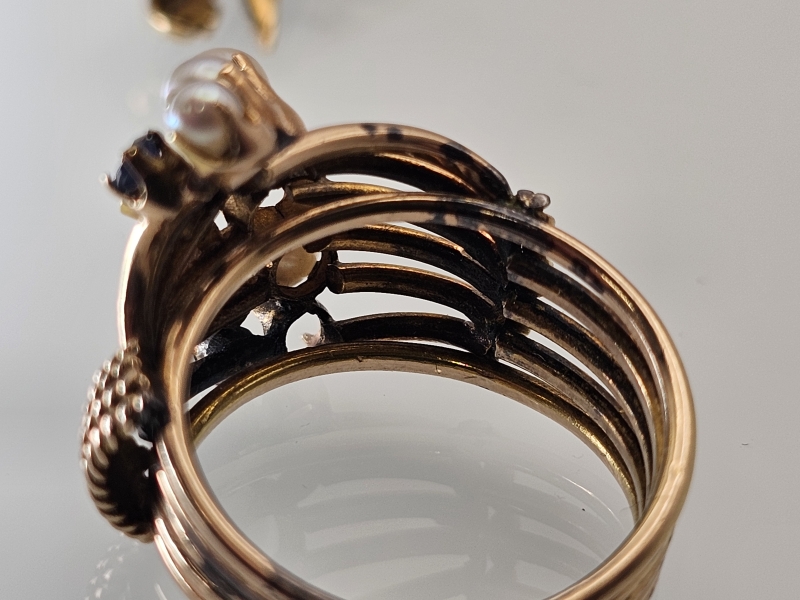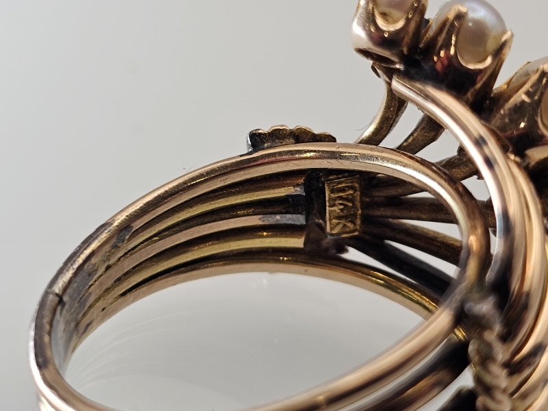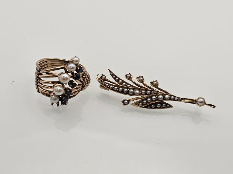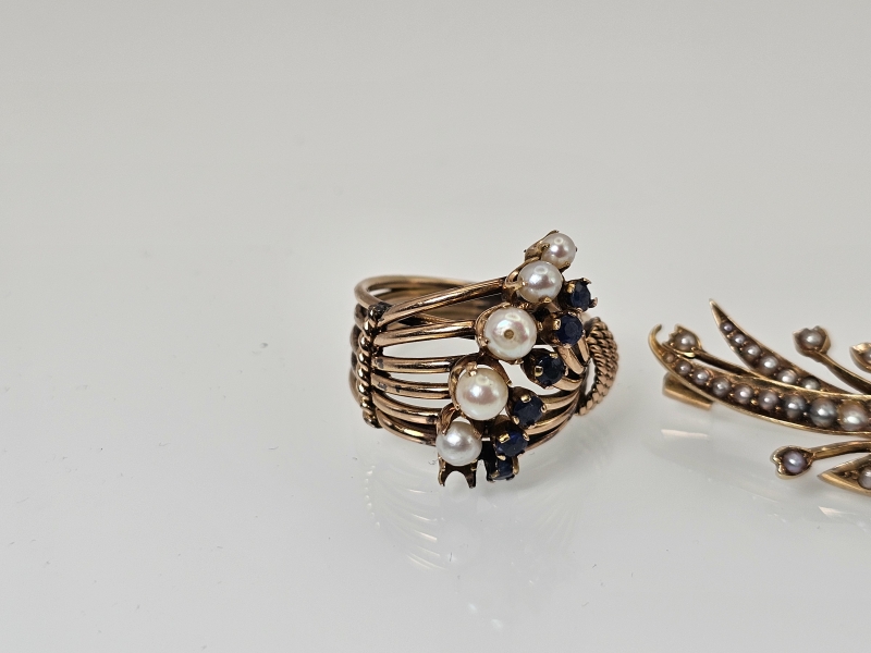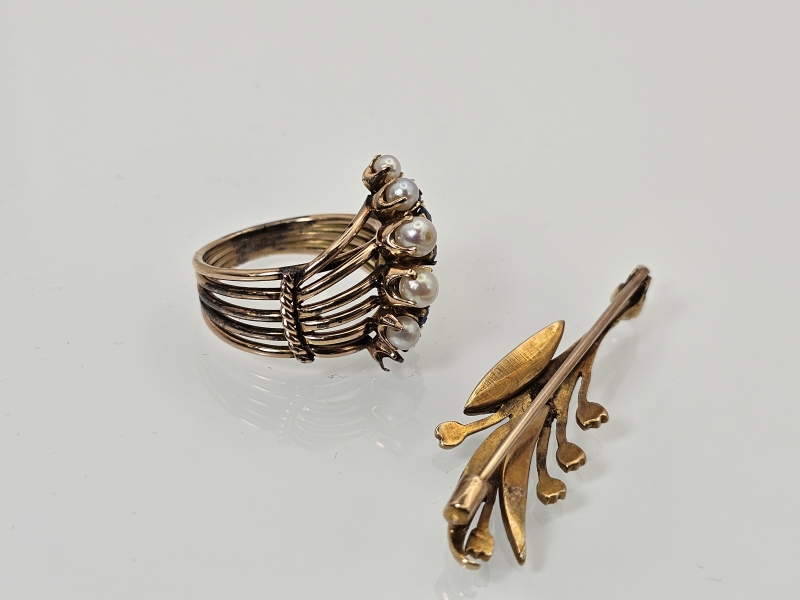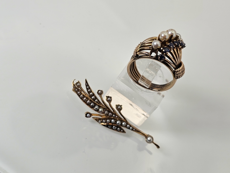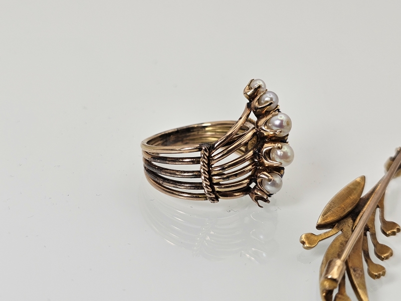 #1580 14k kultainen sormus ja rintaneula helmillä, 10,02g