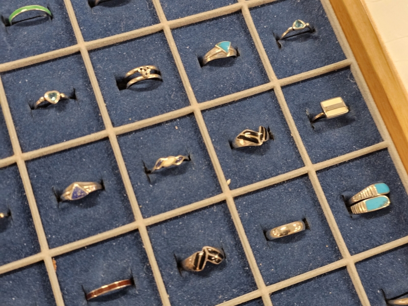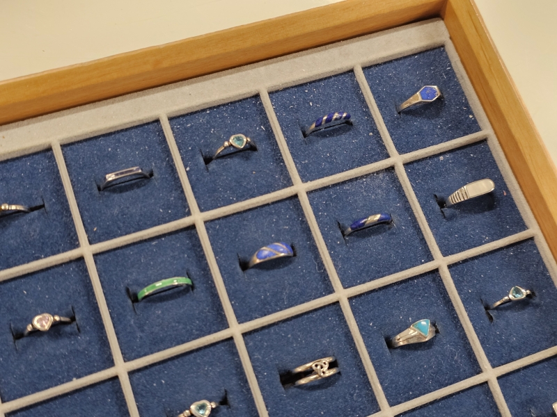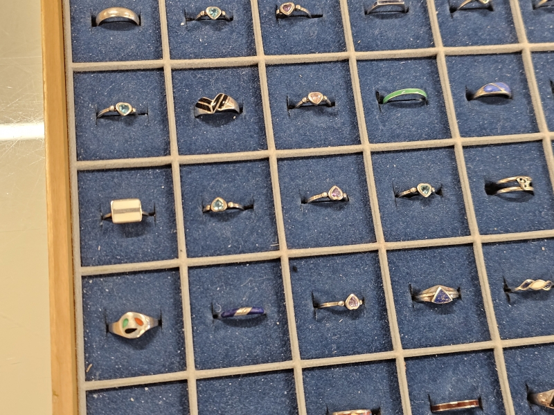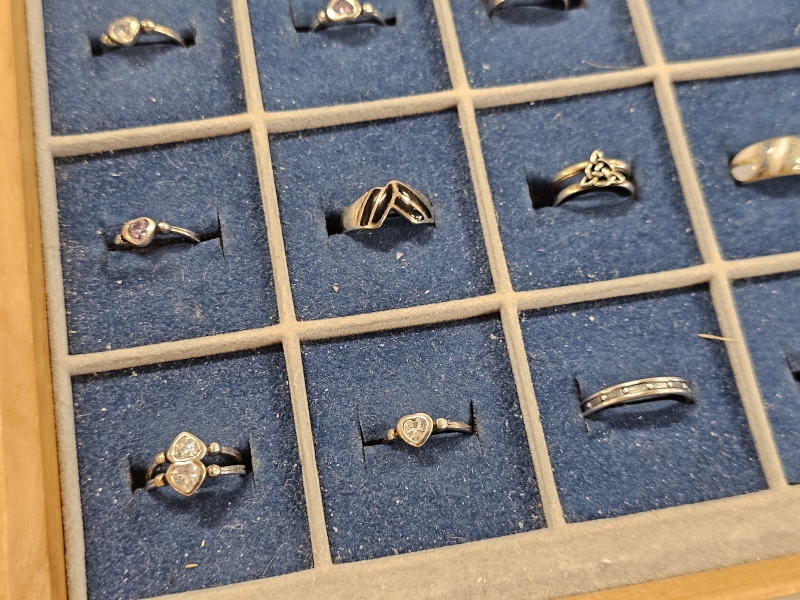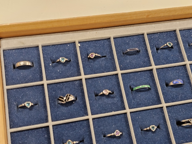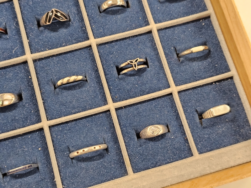 #1639 - Erä hopeasormuksia lokerikossa