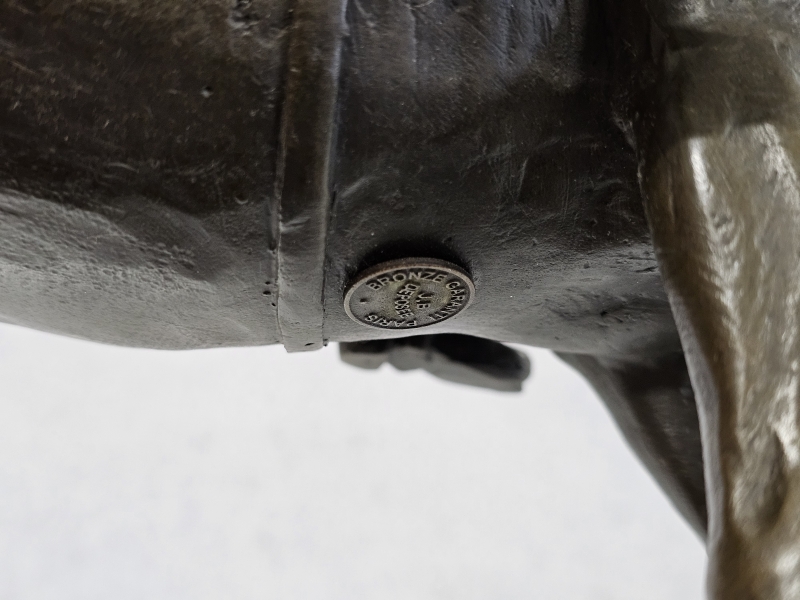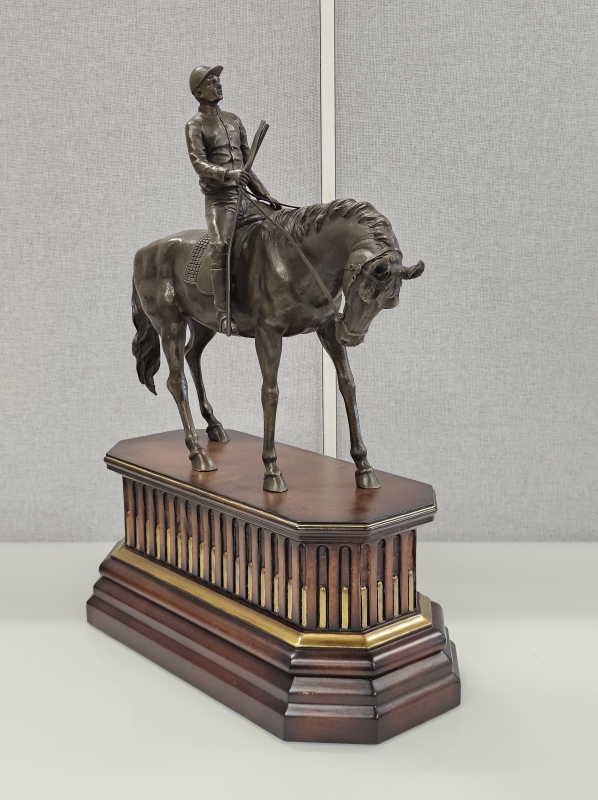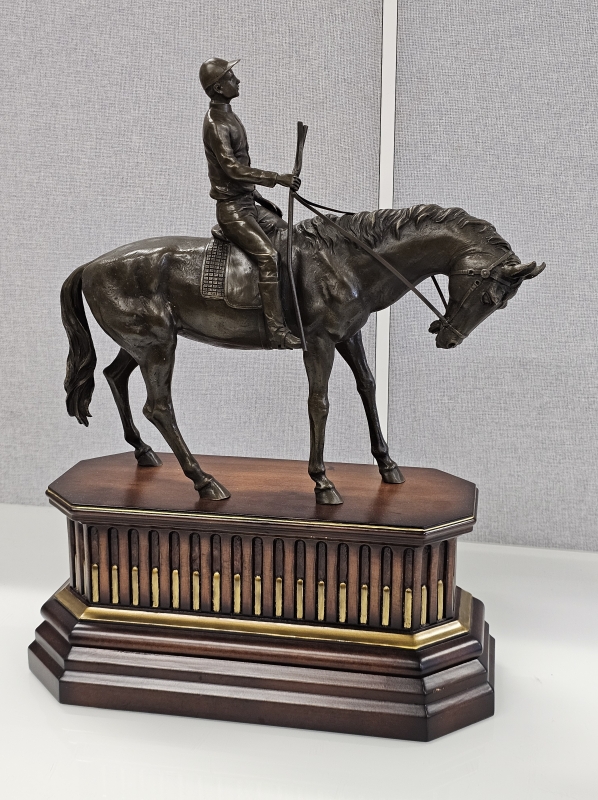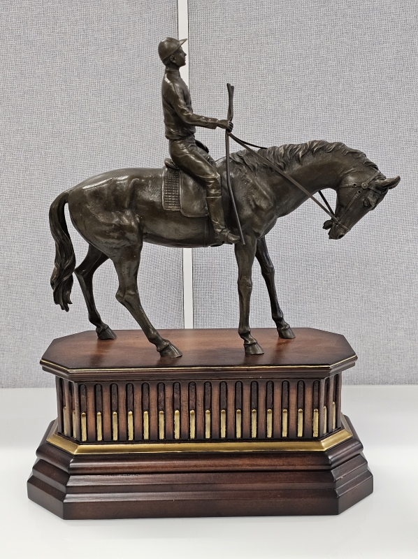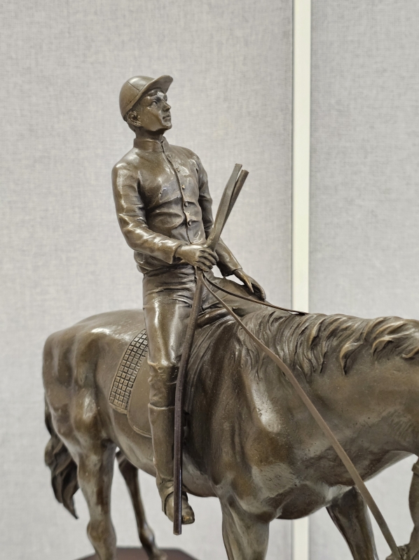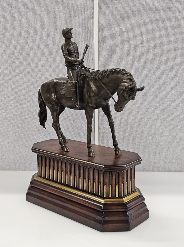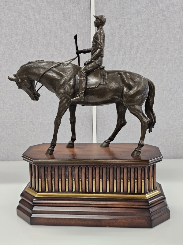 #1926 - Pronssinen ratsastajapatsas puujalustalla