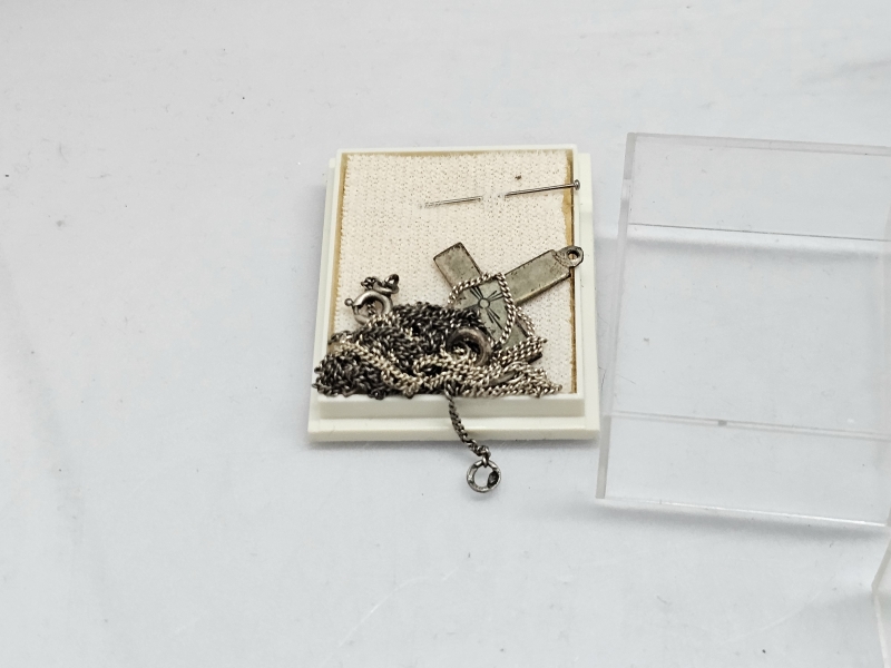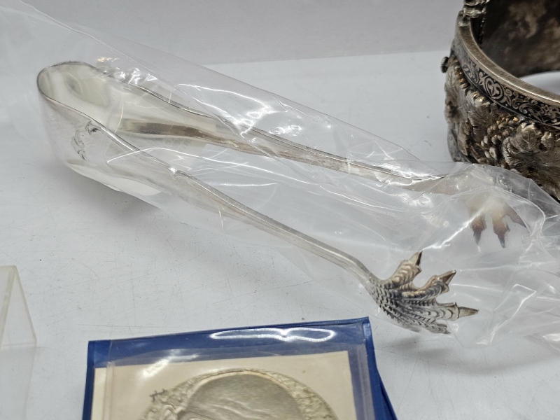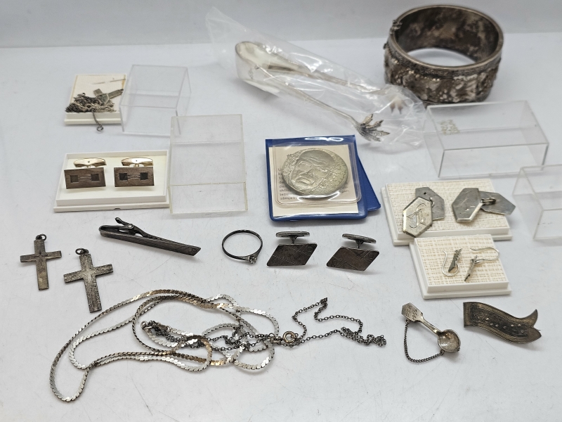 #1013 - Hyvä erä hopeisia korua + hopeinen juhlaraha + sokeripihdit