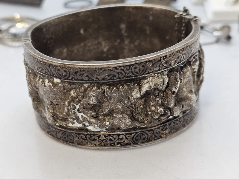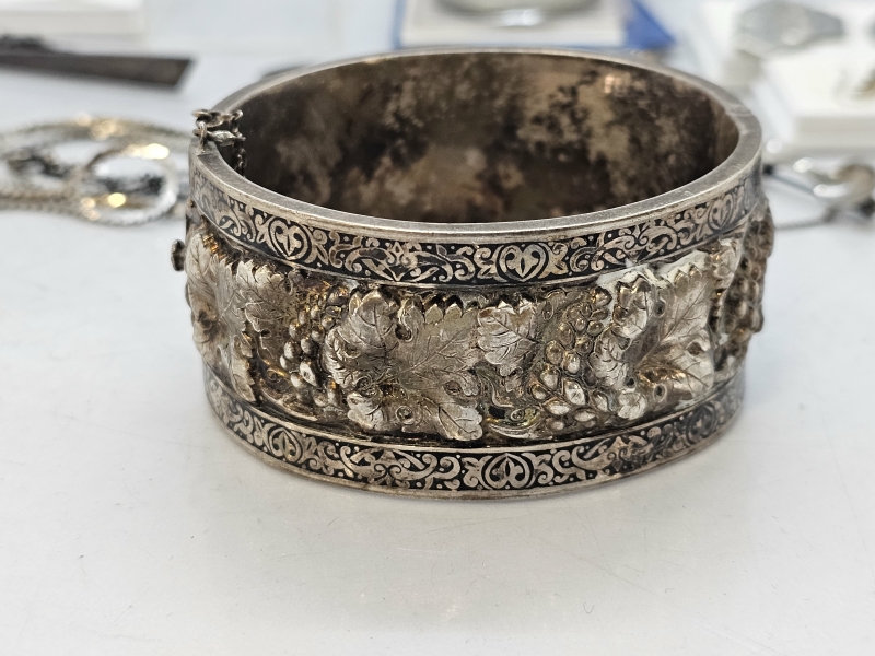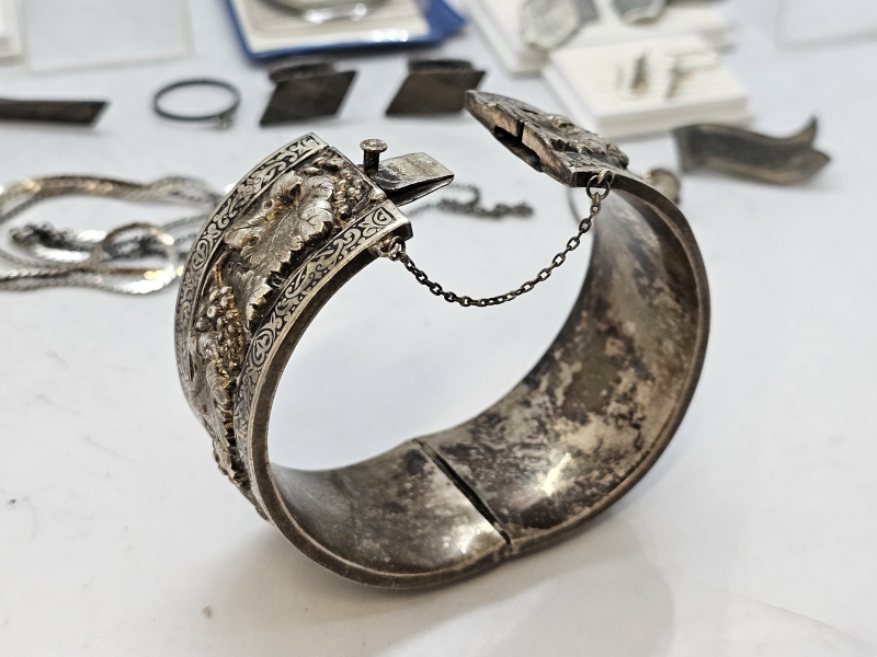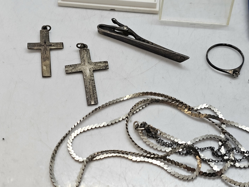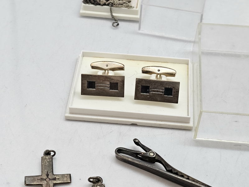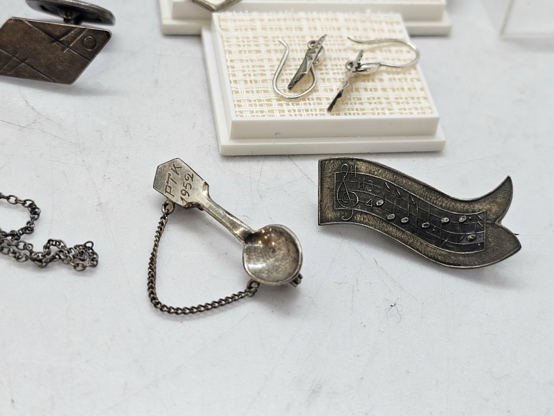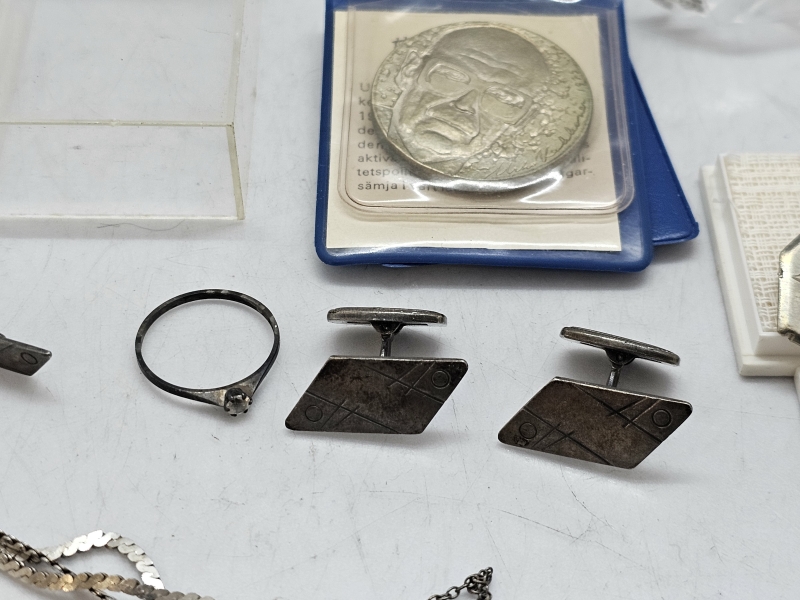 #1013 Hyvä erä hopeisia korua + hopeinen juhlaraha + sokeripihdit