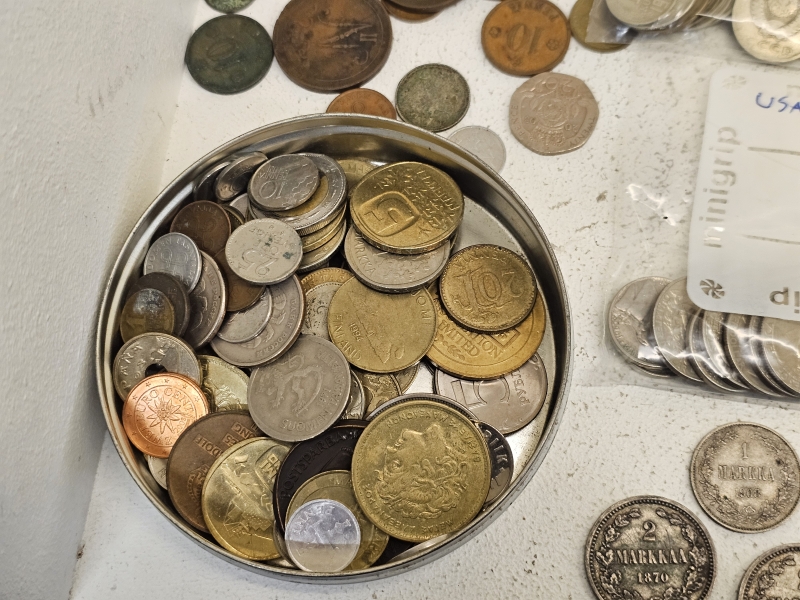 #2192 Erä seteleitä ja kolikoita, joitakin hopeisia