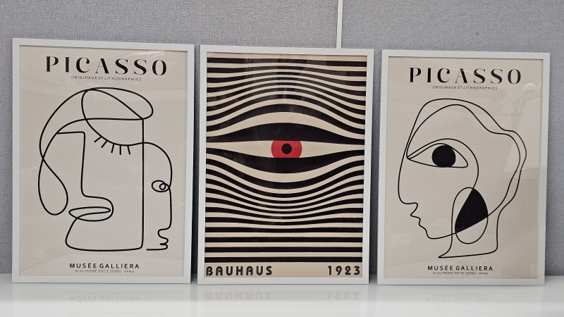 #2136 - 3kpl kehystettyjä näyttelyjulisteiden kangasprinttejä: 2kpl Picasso / 1kpl Bauhaus