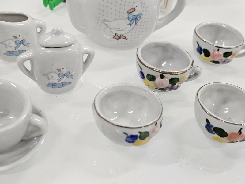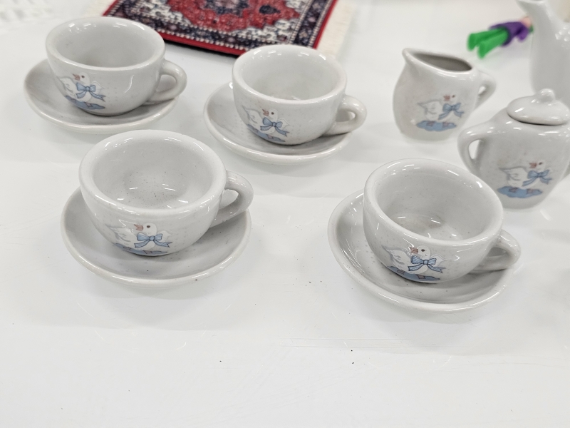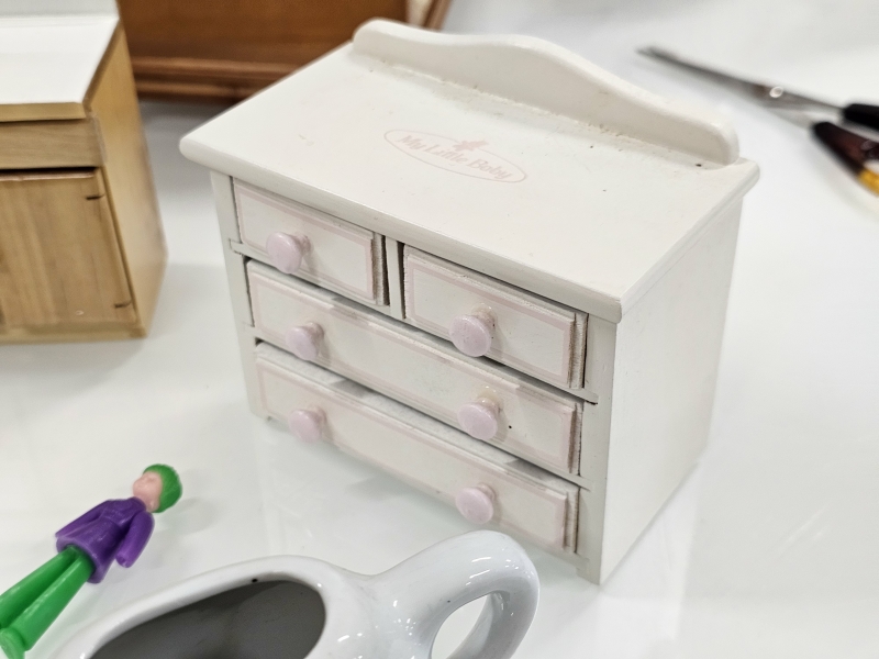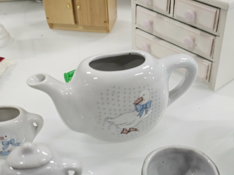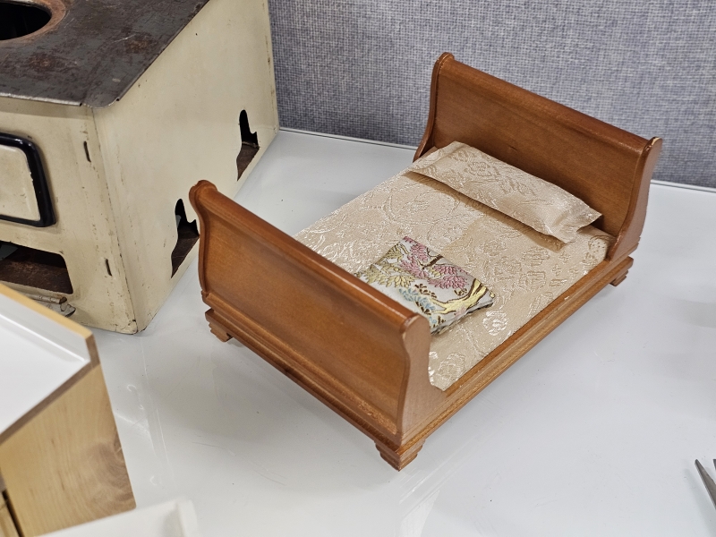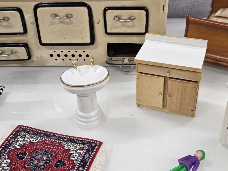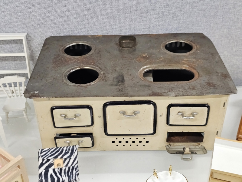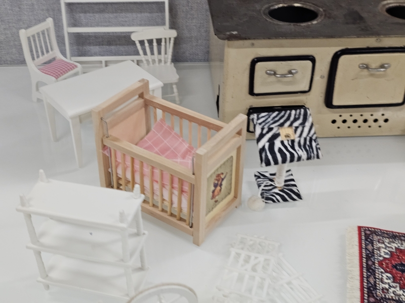 #2068 Nukkekodin kalusteita, lastenastiasto ja peltihella