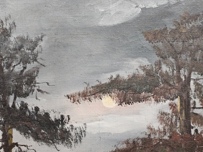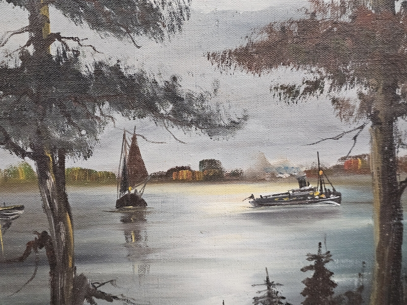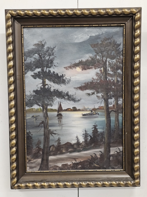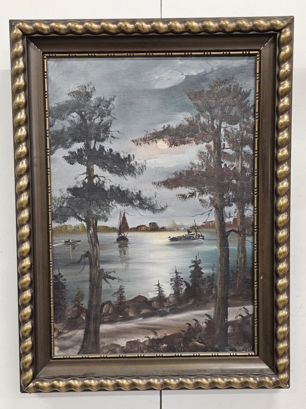 #1931 Vanha öljyvärimaalaus, laiva kuutamolla, signeerattu a tergo mahdollisesti D.Heikkilä