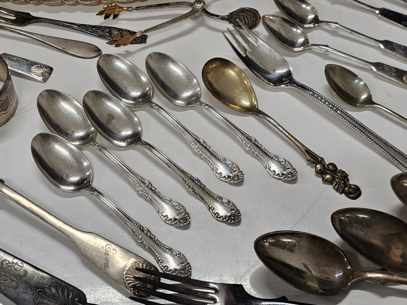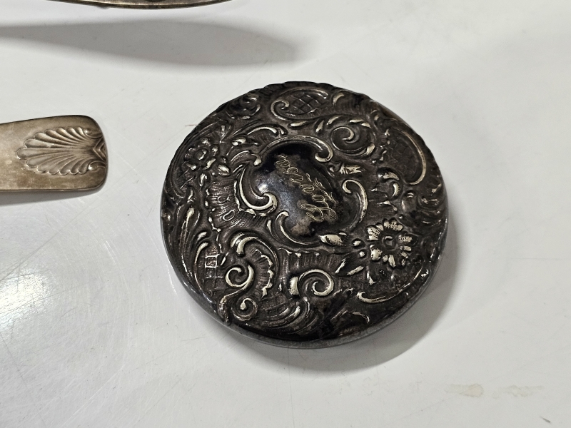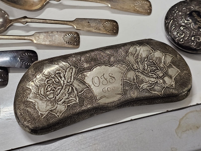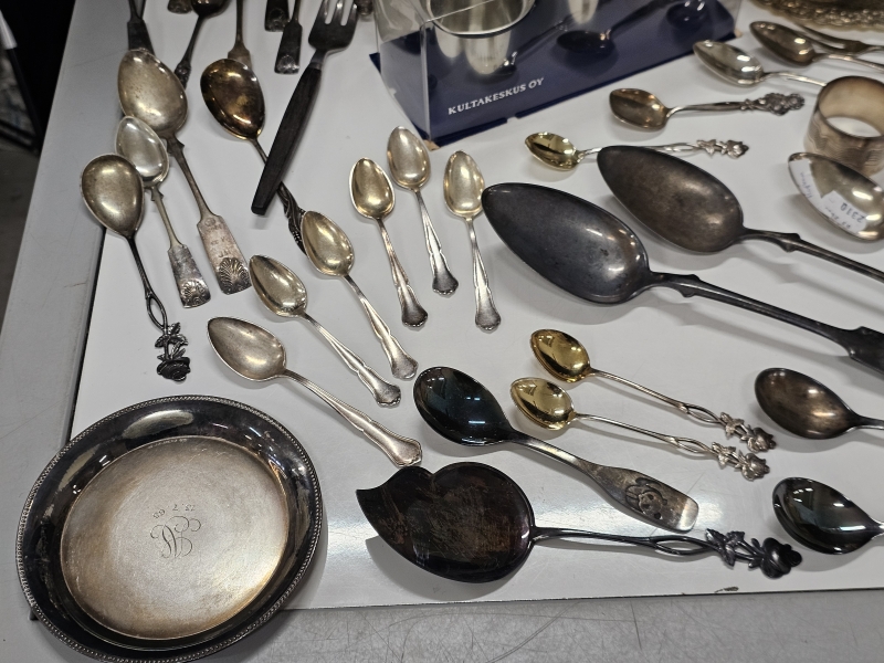 #2142 Iso erä hopeoituja esineitä + tinaa