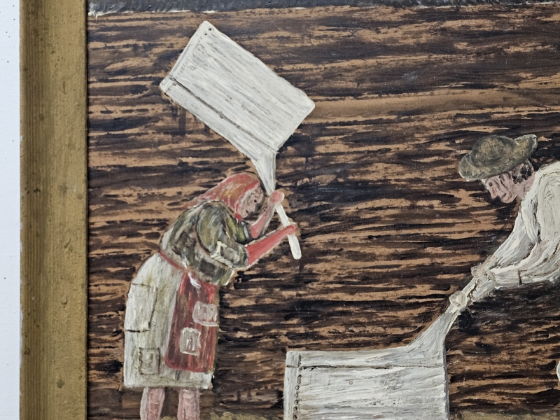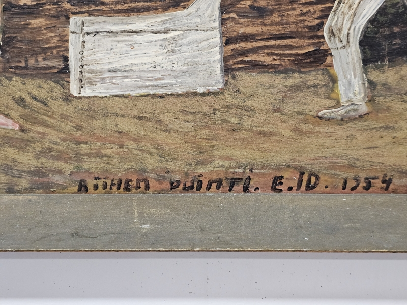 #1881 Öljyvärimaalaus, Enni Id [s.1904, k.1992], "Riihen puinti" 1954
