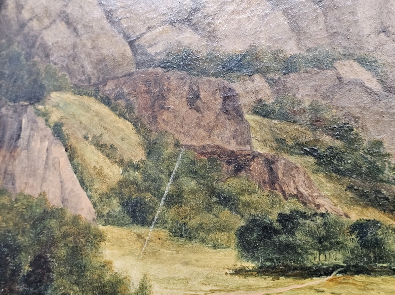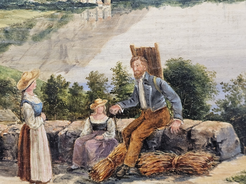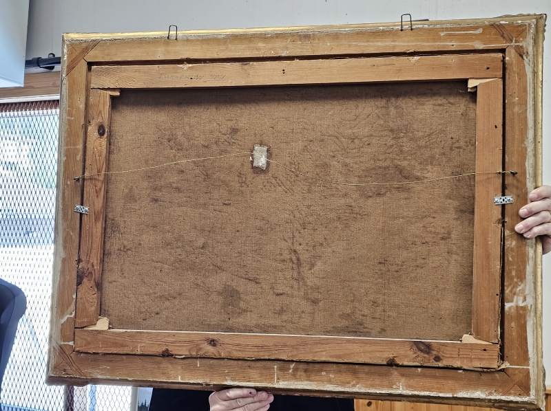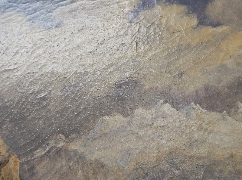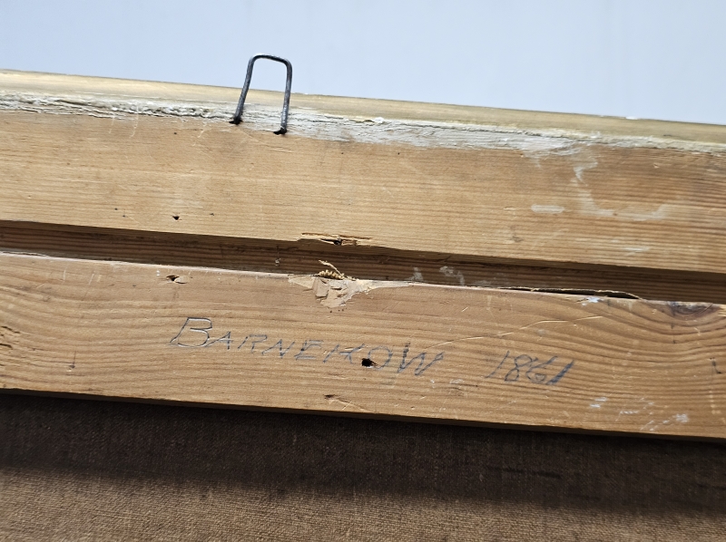 Krakeloitumaa, yhdestä kohdasta maali pois ja yksi korjattu reikä. Kehyksineen 98cm x 74cm. Kehyksissä puutteita. Taiteilija kuuluu kuuluisaan Barnekowin sukuun