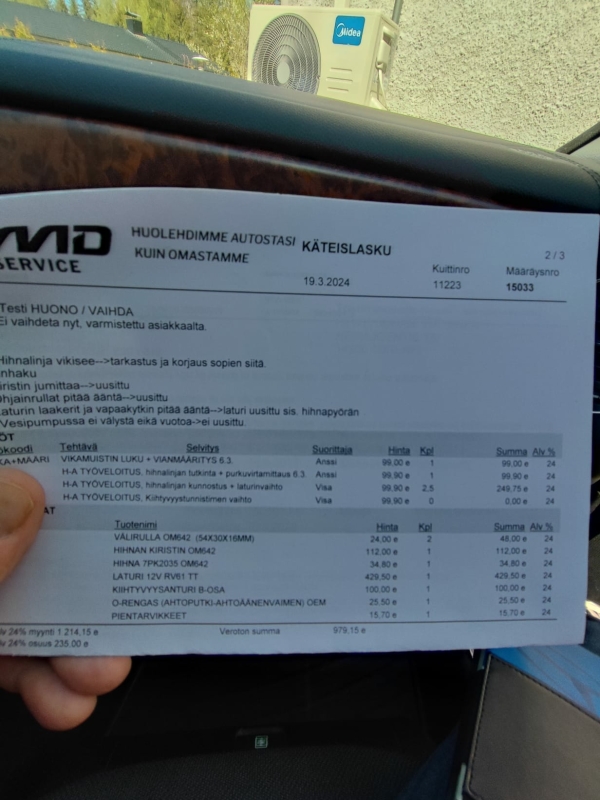 Automaattivaihteisto, kahdet renkaat aluvanteilla, jarrut ja etuiskunvaimentimet uusittu äskettäin, moniurahihna ja laturi uusittu, uusi akku, huollettu viime aikoina usealla tuhannella eurolla ja näistä löytyy kuitit. Alusta rautajousilla joten ei ilmajousiongelmia.