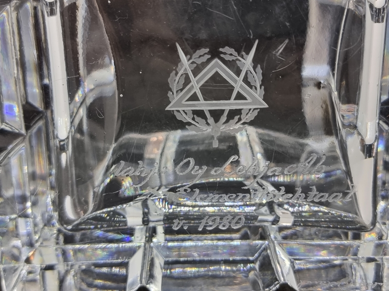 Virheetön. Sign. Kiertopalkinto, kaiverrukset pohjassa ja kyljessä. 16cm x 16cm x 16cm.