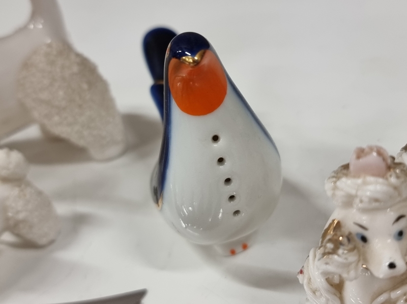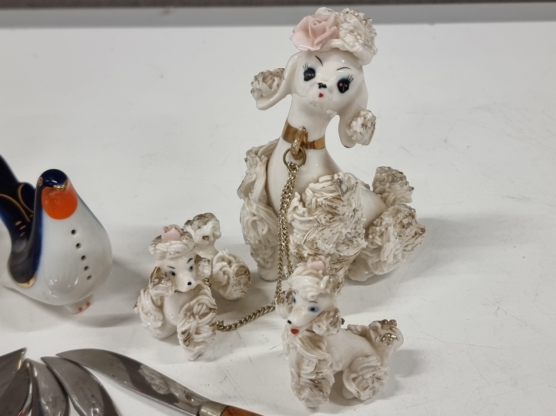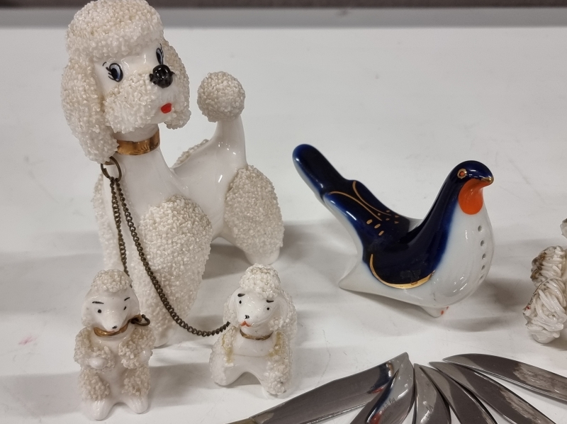 #710 - 2kpl koirafiguureja, Lomonosov-sirotin ja 6kpl Iisakki Järvenpää hedelmäveitsiä.