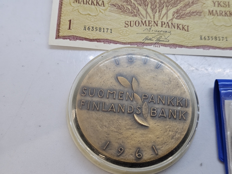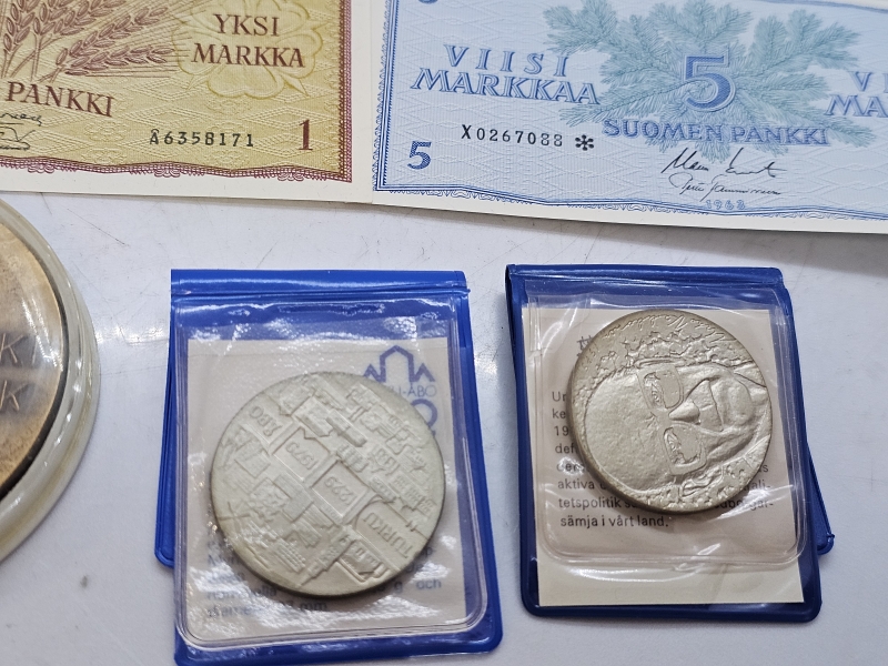 #1500 Erä vanhoja rahoja [mm. 3kpl tähtiseteleitä], pronssinen pöytämitali + 2kpl hopeisia juhlarahoja