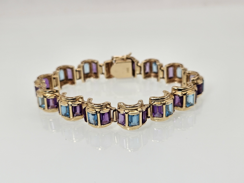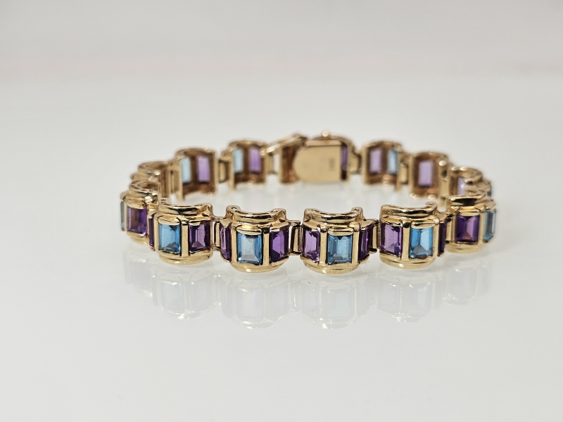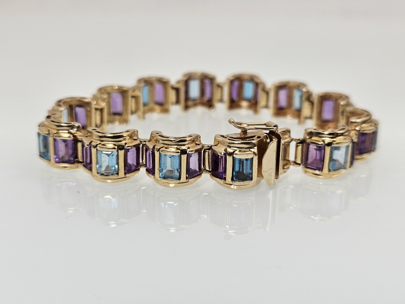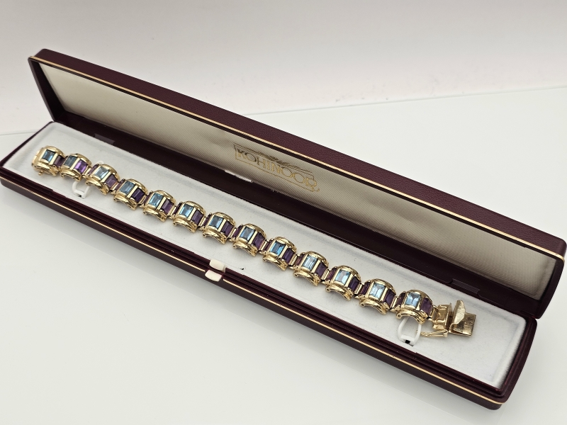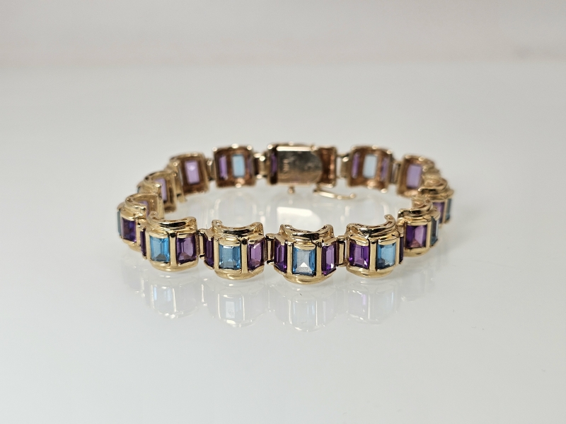 #1070 14k kultainen erittäin näyttävä rannekoru topaaseilla ja ametisteilla, 32,15g