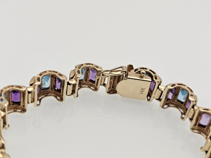 #1070 - 14k kultainen erittäin näyttävä rannekoru topaaseilla ja ametisteilla, 32,15g