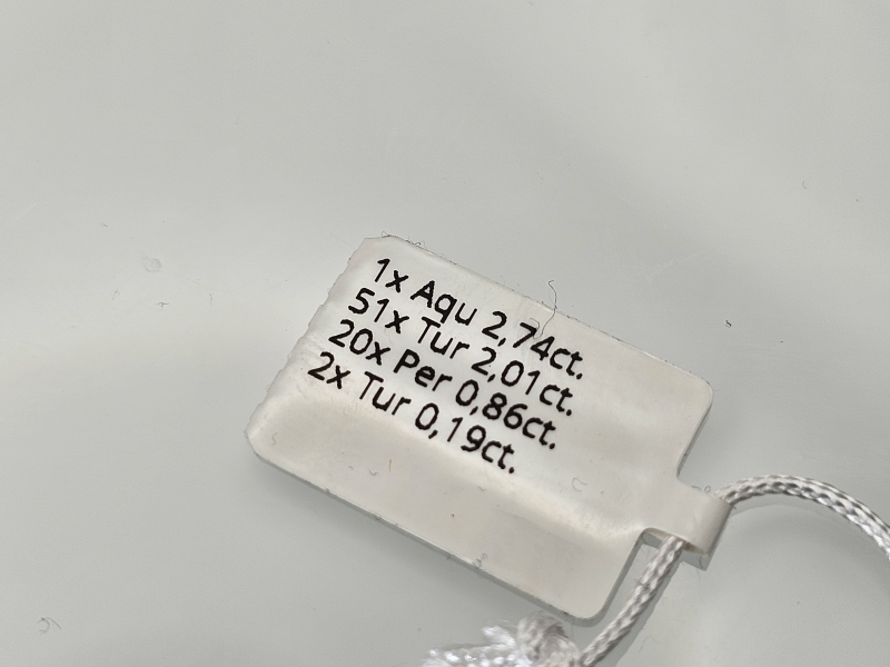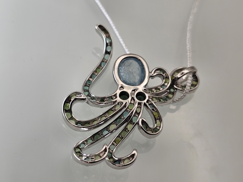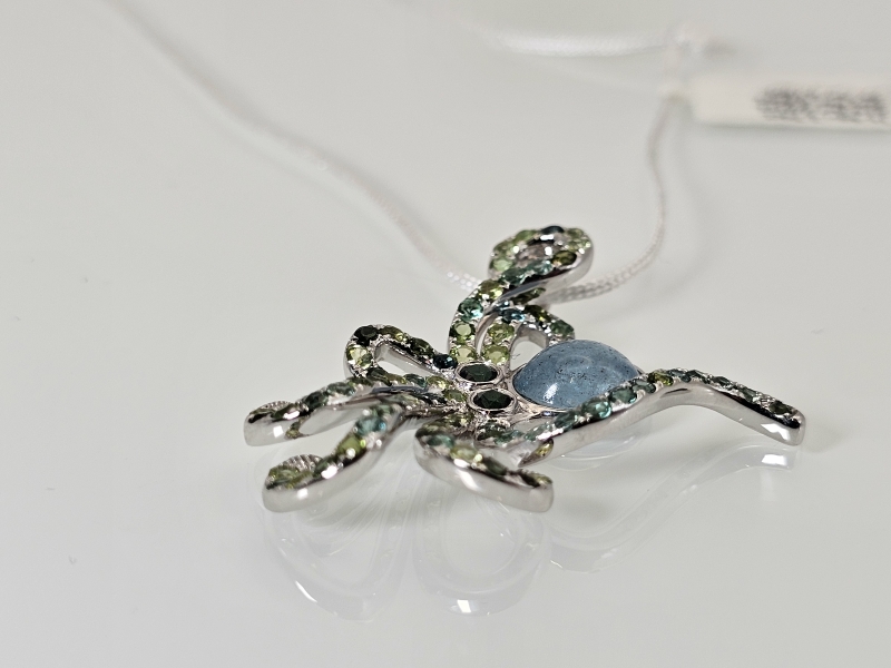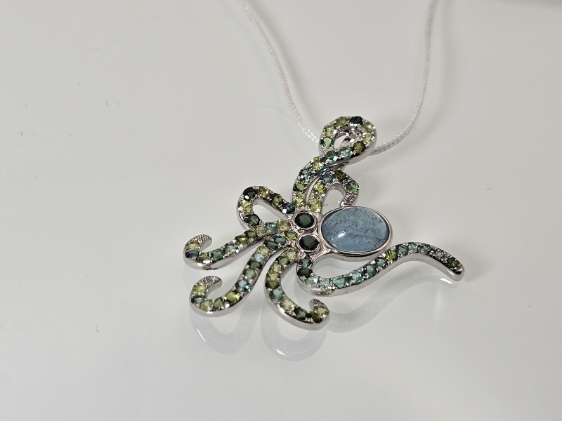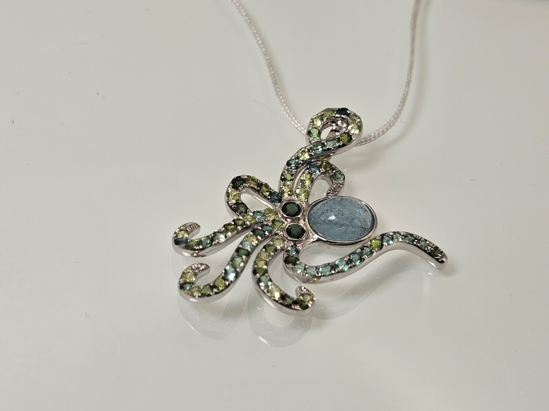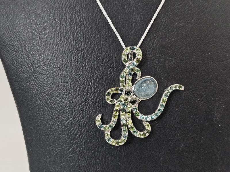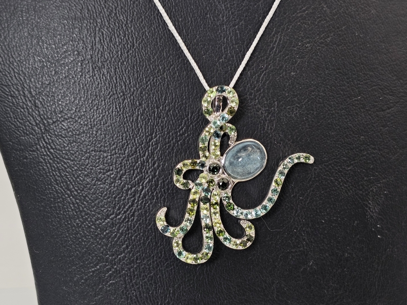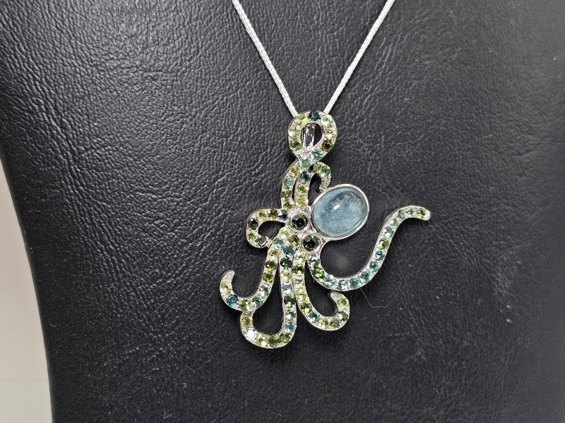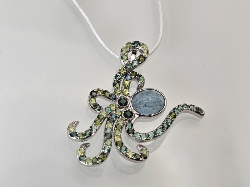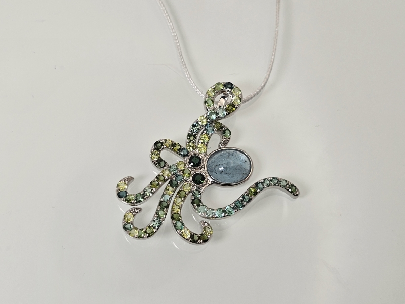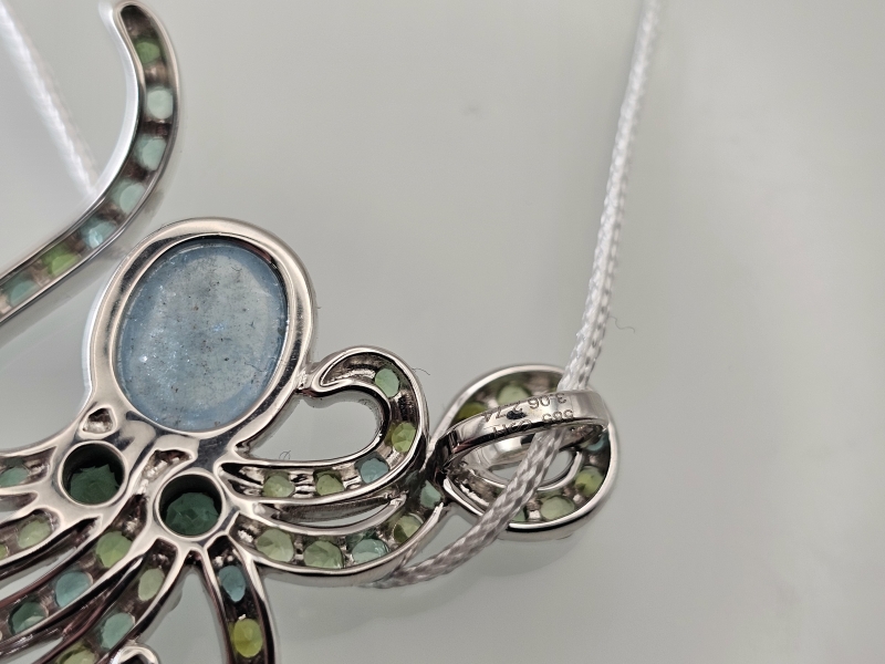 #1105 14k valkokultainen mustekalariipus jossa turmaliineja [51kpl, 2,01ct], 2,74ct akvamariini ja peridootteja [20kpl, 0,86ct], 8,19g