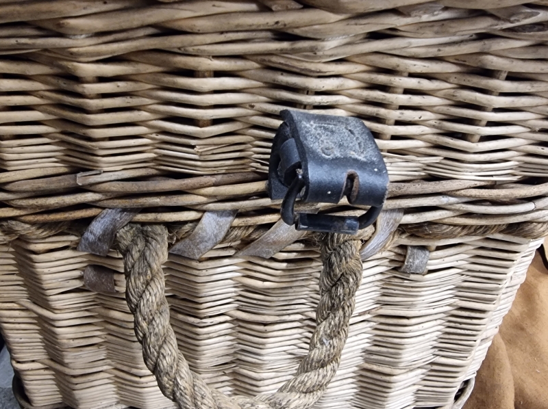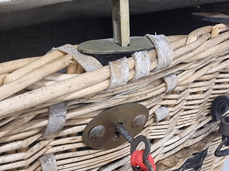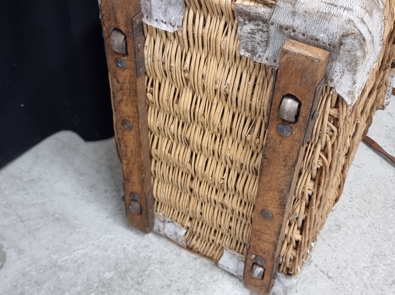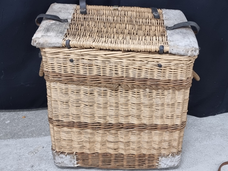 #2100 Rottinkinen lukittava vanha kuljetusarkku pyörillä + asesäkki