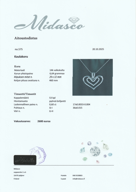 Mukana aitoustodistus sekä uusi korurasia. Bruttopaino 6,64g