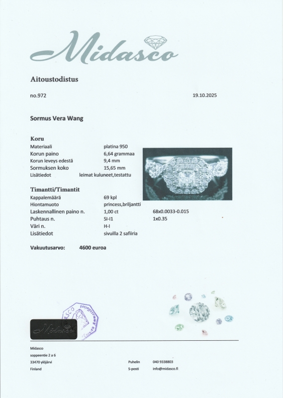 Mukana aitoustodistus sekä uusi korurasia. Koko hyvin muokattavissa ammattilaisen toimesta [ei kuulu hintaan]. Bruttopaino 6,64g. Koko 15,65