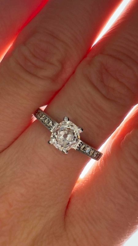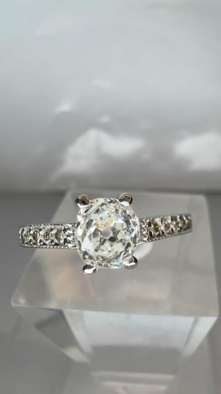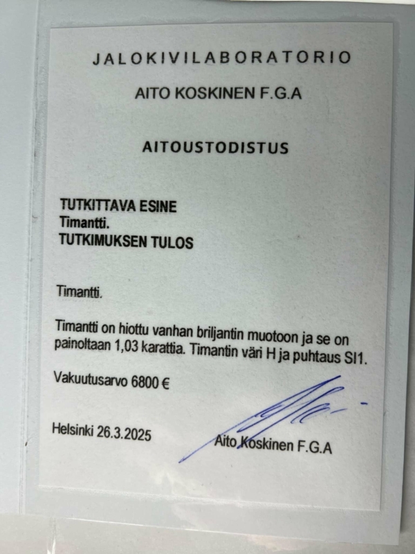 Bruttopaino 2,87g. Ei kaiverrusta. Koko 17.75. Mukana aitoustodistus isoimmalle timantille